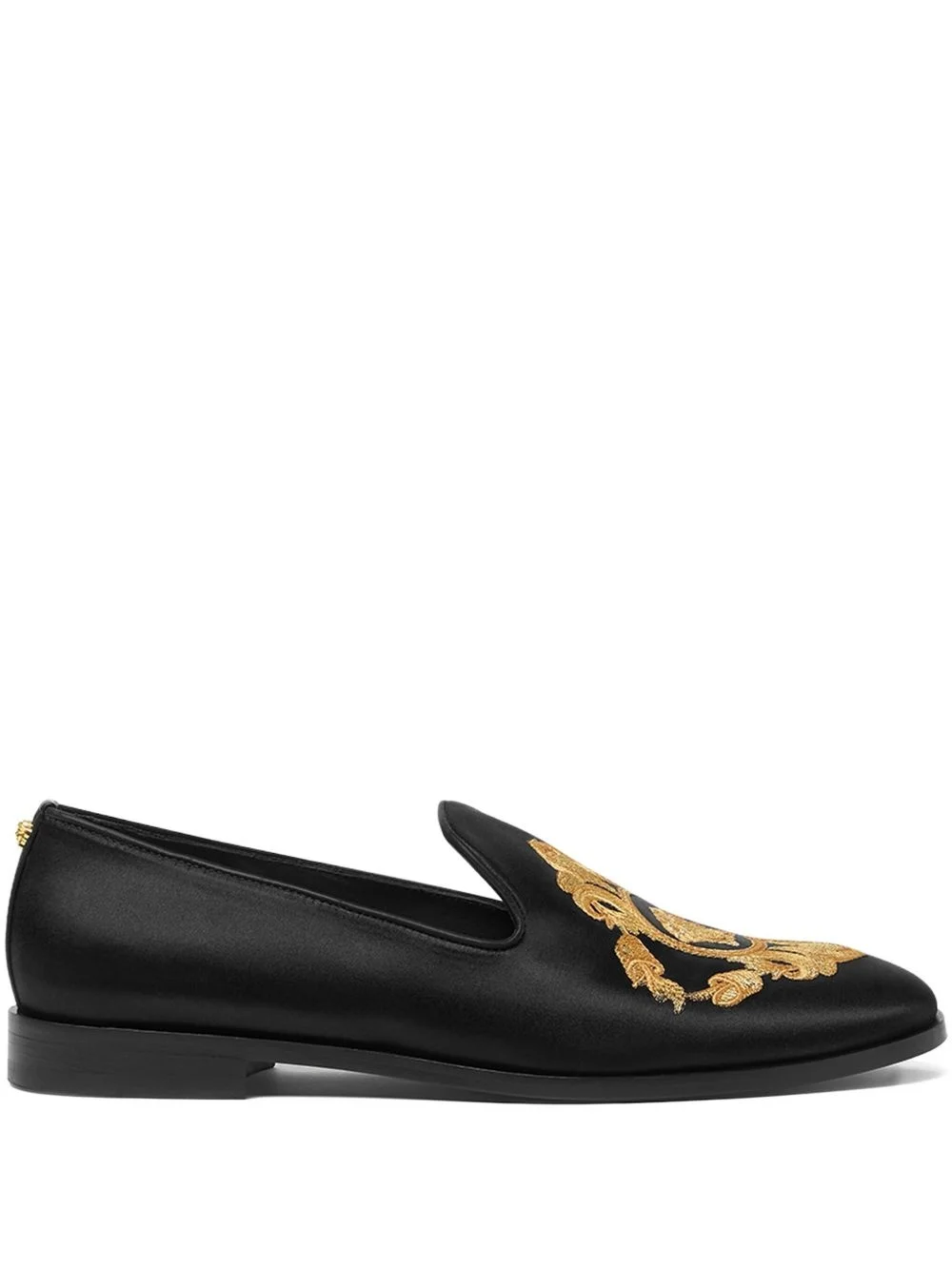 Medusa Head embroidered loafers Highlights - Black - Decorative gold-tone embroidery - Classic loafer silhouette - Slip-on design - Low stacked heel - Almond toe Made in Italy Composition Outer: Leather 100% Lining: Leather 100% Sole: Leather 100%