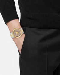 DETAILS Item: - Case: Bicolor (SS&IP2N) case with Versace logo on the top ring / Medusa set between two crystals - Dial: White-Silver dial with Greca on the inner ring / Versace logo at 12h - Bracelet: Bicolor (SS&IP2N) band with butterfly buckle - Movement: RONDA 762.3 Swiss Quartz 2-hands movement - Water Resistant: 5 ATM Item: PVE7E004-P0023_RTU_TU_PNUL__ SIZE & FIT - Case: 1.7" / 43 mm
