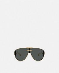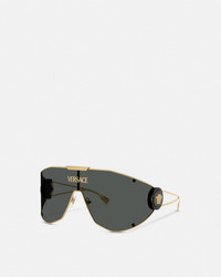 DETAILS Wide and dynamic mask sunglasses featuring the Medusa hardware at the temples and a logo accent at the nose bridge. - Logo - Medusa hardware - Frame color: Gold - Temple color: Gold - Lens color: Dark gray - Frame: Metal - Temple: Metal Item: O2268-O10028742_RTU_TU_ONUL__ SIZE & FIT - Eye size: 1.7" - Temple: 4.5"