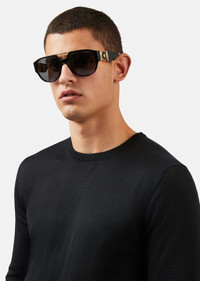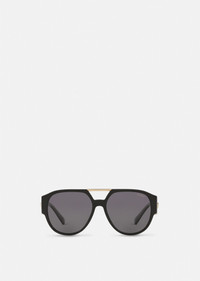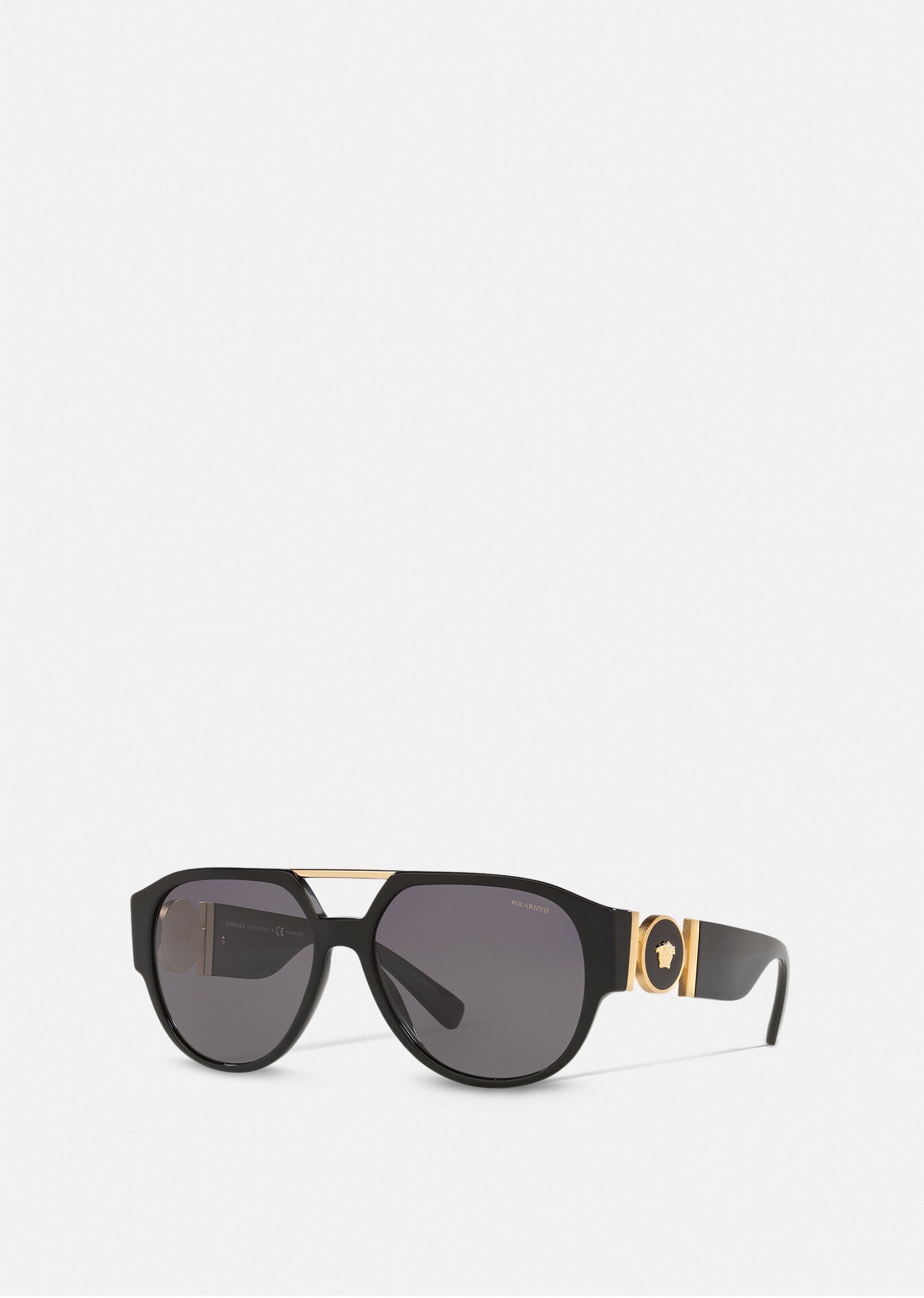 Pilot shape sunglasses featuring a black frame and grey lenses. Enriched with an elegant gold-tone Medusa stud on an enamel medallion. DETAILS & CARE - Material: Acetate - Frame and temple color: Black - Lens color: Grey - Polarized - Detail: Medusa stud on enamel medallion - UV 3N - Made in Italy SIZE & FIT - Width: 58 - Bridge: 16 - Temple: 140 - Base: 6D