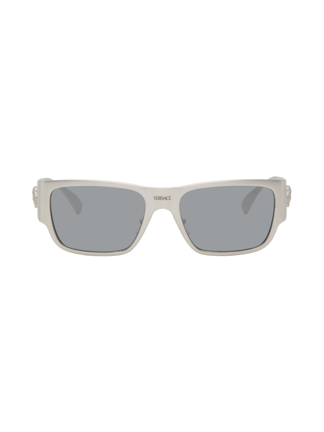 Rectangular brushed metal-frame sunglasses in silver tone. · Gray lenses · Logo etched at bridge · Adjustable rubber nose pads · Signature Medusa hardware at temples · Includes hardside case · Size: 56.18 140 Supplier color: Silver