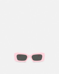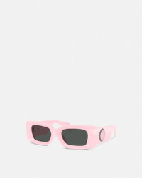 DETAILS These square-frame sunglasses feature injected frames with a tonal Medusa emblem at the temples and a metal Greca frame. - Medusa motif - Greca border - Frame color: Pink - Temple color: Pink - Lens color: Dark gray - Frame: Injected - Temple: Injected Item: O4474U-O54858752_RTU_TU_ONUL__ SIZE & FIT - Eye size: 2.0"