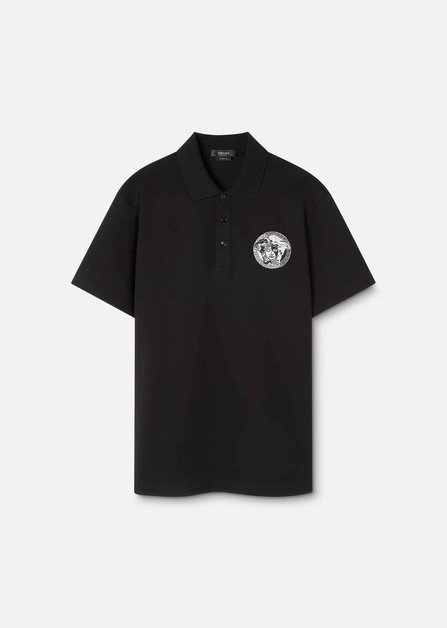 Made from cotton piqué, this short-sleeved polo shirt features a Medusa embroidery at the chest and a three-button placket. DETAILS & CARE - Medusa embroidery - Short sleeves - Pointed collar - Three-button placket - Outer Fabric: 100% Cotton - Embroidery: 100% Viscose - Trim: 100% Cotton - Machine wash cold (delicate) - Do not bleach - Do not tumble dry - Cool iron on reverse with damp cloth on top - Delicate dry clean - Wash inside out SIZE & FIT - All sizes fit Italian standards