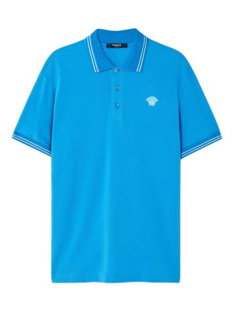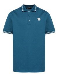 Medusa polo shirt Highlights - Teal blue - Stripe detail at the collar - Medusa head logo - Short sleeves - Ribbed trims - Button fastening Imported Composition Organic Cotton 100%, Polyester 100% Washing instructions Read Manufacturer Guidelines