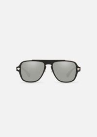 Retro--inspired, yet very contemporary, these pilot shaped sunglasses feature an elegant matte black frame paired with mirrored grey lenses. Enriched with silver tone hardware - Medusa studs and logo on the temples. DETAILS & CARE - Frame color: Matte black - Temple color: Matte black - Lens color: Light grey, mirrored silver - Details: Silver tone Medusa studs and Versace logo on temples - Nylon fibre on metal - Made in Italy SIZE & FIT - Eye size: 56 - Bridge: 18 - Temple: 145