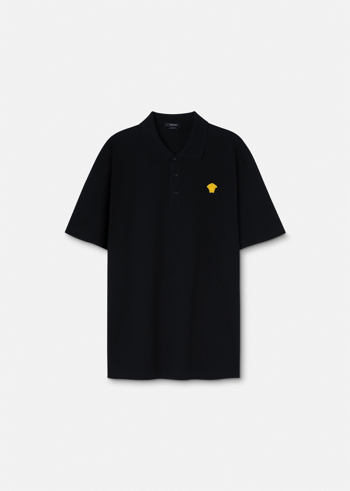 DETAILS In a slim fit, this short-sleeved polo shirt is made from cotton piqué with a three-button placket and features an embroidered Medusa at the chest. - Embroidered Medusa motif - Short sleeves - Pointed collar - Three-button placket - Outer composition: 100% Cotton - Embroidery: 100% Polyester - Trim: 100% Cotton Item: 1008492-1A06071_1B000 SIZE & FIT - In Versace’s Taylor Fit: designed for a slim silhouette - The model is 6'1" tall and wears size 48 IT