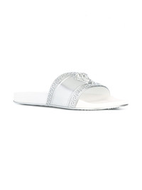 Medusa slider sandals Since 1978, Versace have been synonymous with luxury fashion. For their SS17 collection, their iconic prints and glamorous designs sit alongside sleek, modern ideas. These white and silver-tone Medusa slider sandals feature an open toe, a front logo plaque, a slip-on style, a brand embossed insole and a flat rubber sole. Made in Italy Composition Sole: Rubber 100% Lining: Polyurethane 100% Outer: Polyurethane 100% SIZE & FIT Measurement HEEL 0.59 in(1.5 cm)