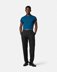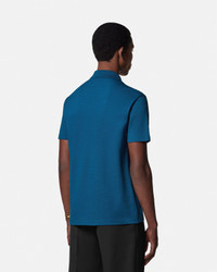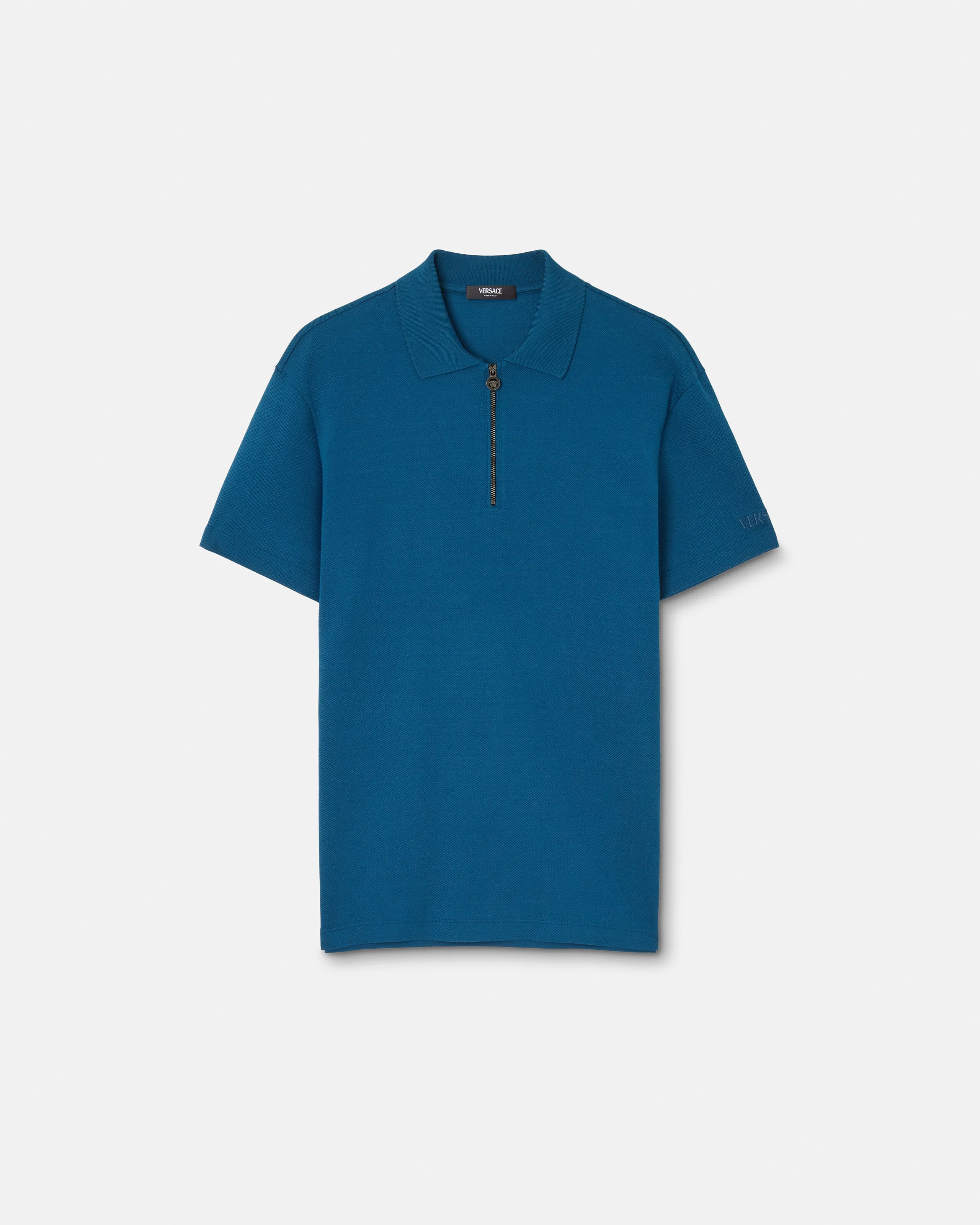 This short-sleeved, cotton'-pique polo shirt has a slim fit and features a front zip closure with a Medusa Biggie puller and a tonal Versace logo embroidery on the sleeve. - Medusa Biggie hardware - Short sleeves - Pointed collar - Front zip closure - Outer composition: 100% Cotton - Embroidery: 100% Viscose - Trim 1: 100% Cotton - Trim 2: 100% Polyester - Fabric made from organic cotton yarn Size & Fit - The model is 6'1" / 1.87 m tall and wears size 48 IT Item: 1018848-1A13492_1UO60