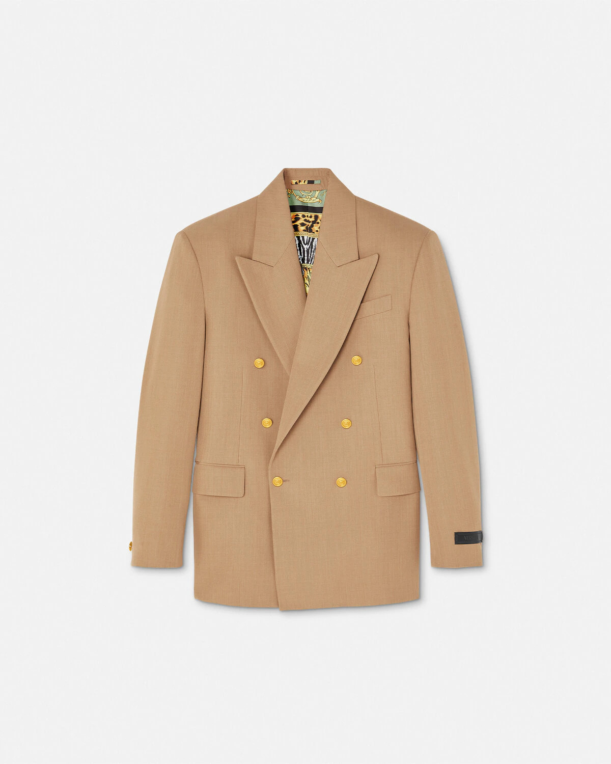 DETAILS This wool mlange doublebreasted blazer features a peaked lapel and accent Medusa buttons The sartorial style is detailed with a jacquard Versace tailoring label at the sleeve Its fully lined featuring the Wild Cats print a reinterpretation of an archival print of the animal kingdom with zebra and leopard patterns - Medusa hardware - Wild Cats print lining - Versace tailoring label - Long sleeves - Peaked lapel - Chest welt pocket - Front flap pockets - Interior welt pockets - Front button closure - Buttoned cuffs - Back vent - Outer Composition: 100% Pure Virgin Wool - Lining 1: 100% Polyester - Lining 2: 100% Cupro - Lining 3: 100% Cotton Item: 1021528-1A15433_1NJ00 SIZE & FIT - The model is 6'2" / 1.87 m tall and wears size 48 IT