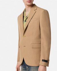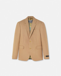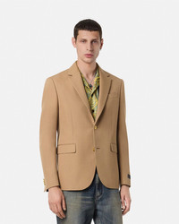 DETAILS This wool mlange singlebreasted blazer features a notched lapel and accent Medusa buttons The sartorial style is detailed with a jacquard Versace tailoring label at the sleeve Its fully lined featuring the Wild Cats print a reinterpretation of an archival print of the animal kingdom with zebra and leopard patterns - Medusa hardware - Wild Cats print lining - Versace tailoring label - Long sleeves - Notched lapel - Front button closure - Chest welt pocket - Front flap pockets - Interior welt pockets - Single back vent - Buttoned cuffs - Outer Composition: 100% Pure Virgin Wool - Lining 1: 100% Polyester - Lining 2: 100% Cupro - Lining 3: 100% Cotton Item: 1021530-1A15433_1NJ00 SIZE & FIT - The model is 6'2" / 1.87 m tall and wears size 48 IT