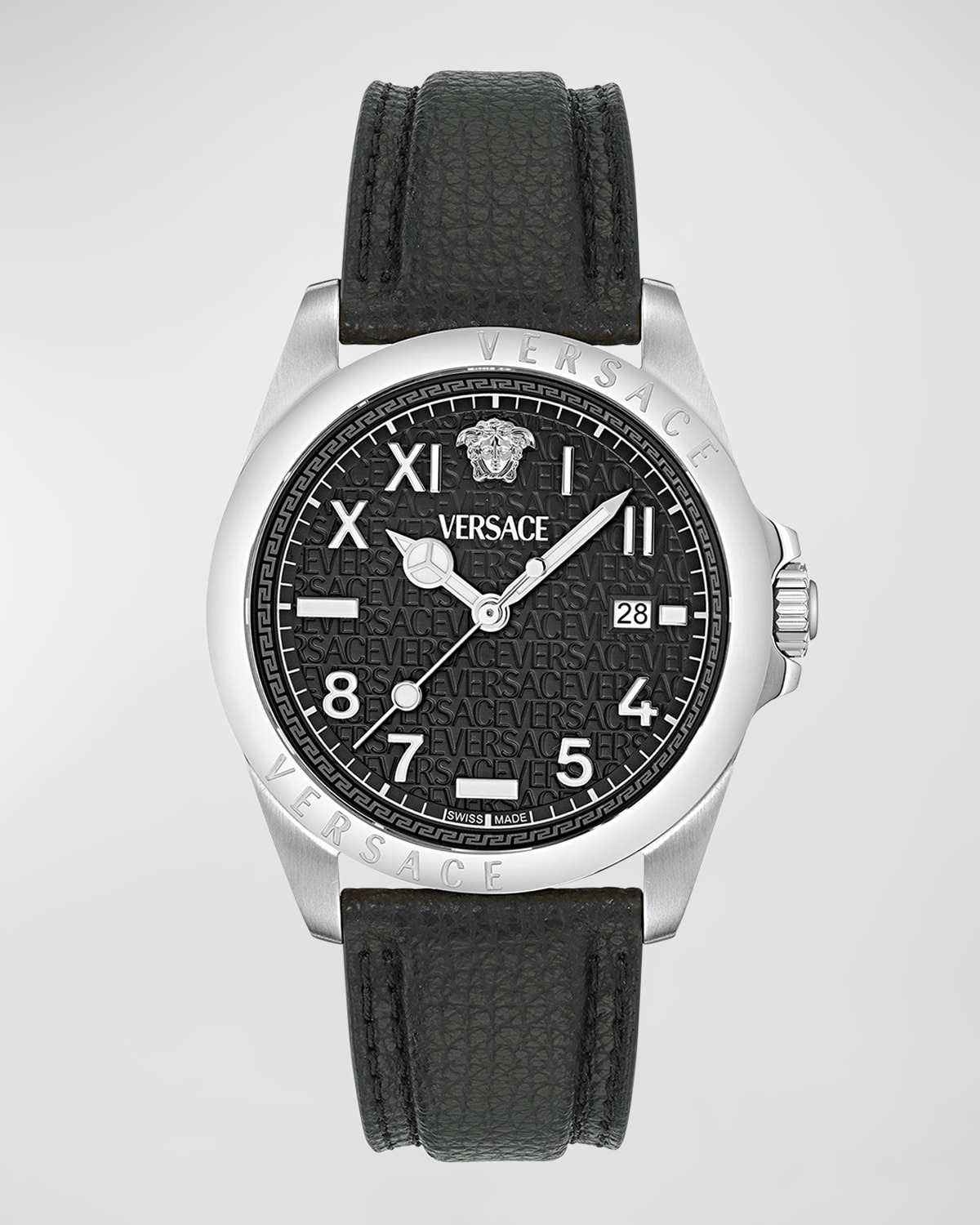 - Versace "Anteo" men's watch - 41mm; polished and brushed stainless steel case - Sapphire crystal glass - Logo bezel - Black guilloche dial - Medusa Head and logo at 12 o'clock - Date window at 3 o'clock - Grained calf leather strap - Adjustable prong buckle - Water resistant at 5 ATM - Quartz movement - Made in Switzerland