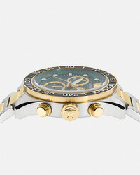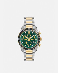 DETAILS The Greca Dome Chrono watch maintains an innovative design with its dome-shaped glass and statement top ring featuring Versace lettering and a Greca motif. The dial has a Versace Allover logo pattern, a three-dimensional Medusa at 12 o'clock and Greca on the inner ring. The case is complete with a chrono movement and bold indexes. - Case: Stainless Steel and IP Champagne case; IP Black top-ring with minute track and Versace logo - Dial: Green dial with Versace Allover, Greca pattern, and Greca on the inner dial; Versace logo and Medusa at 12h - Bracelet: Stainless Steel and IP champagne band with butterfly buckle - Movement: RONDA VEM297 Swiss quartz Chrono movement; Date at 4h - Water Resistant: 5 ATM Item: PVE6K004-P0023_RTU_TU_PNUL__ SIZE & FIT - Case size: 1'7" in