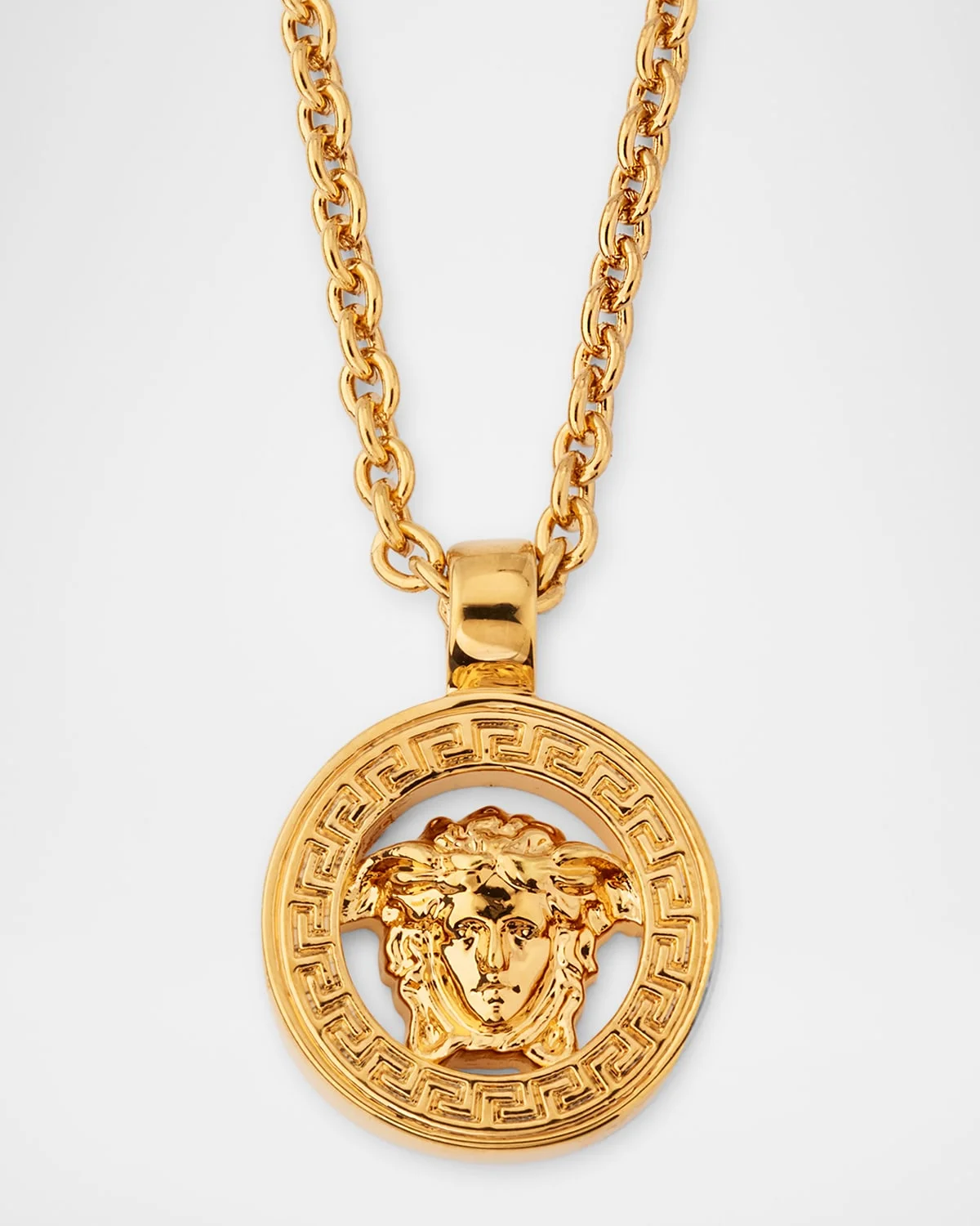 The "Medusa '95" necklace from Versace showcases a threedimensional opendesign Medusa pendant with La Greca engraving. Necklace length approx. 16.921 inches Pendant approx. 0.5"L x 0.1"W x 0.5"H Goldtone or silvertone metal Adjustable length Lobster clasp All the materials are hypoallergenic Made in Italy