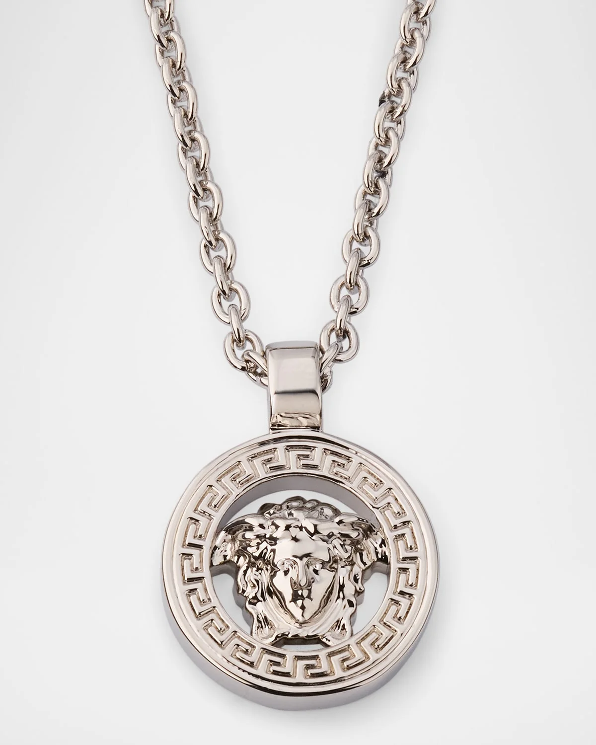 The "Medusa '95" necklace from Versace showcases a threedimensional opendesign Medusa pendant with La Greca engraving. Necklace length approx. 16.921 inches Pendant approx. 0.5"L x 0.1"W x 0.5"H Goldtone or silvertone metal Adjustable length Lobster clasp All the materials are hypoallergenic Made in Italy