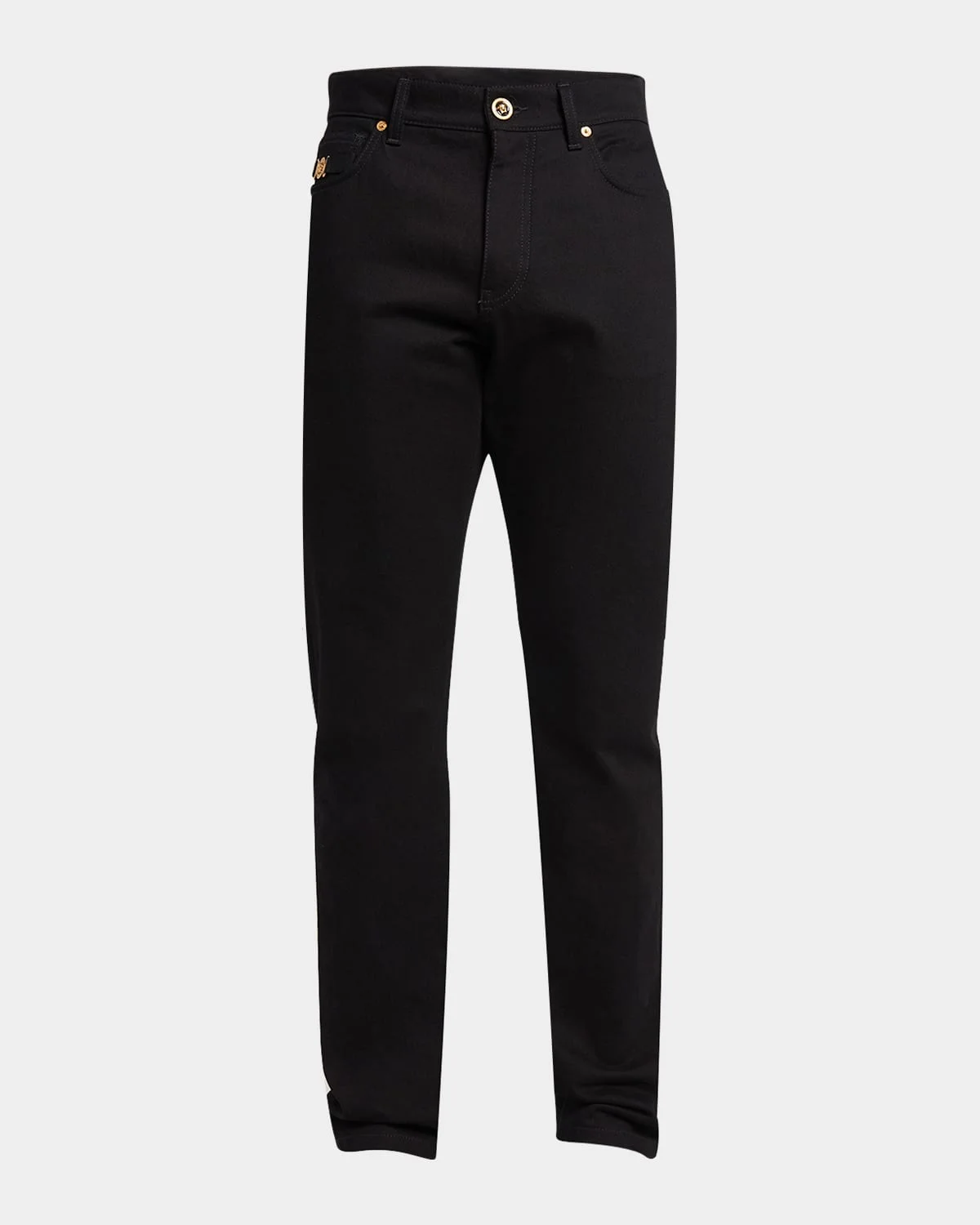 Versace jeans in black denim with goldtone Medusa hardware Regular rise Fivepocket style Straight legs Button/zip closure; belt loops Leather logo patch at back waist Cotton Made in Italy