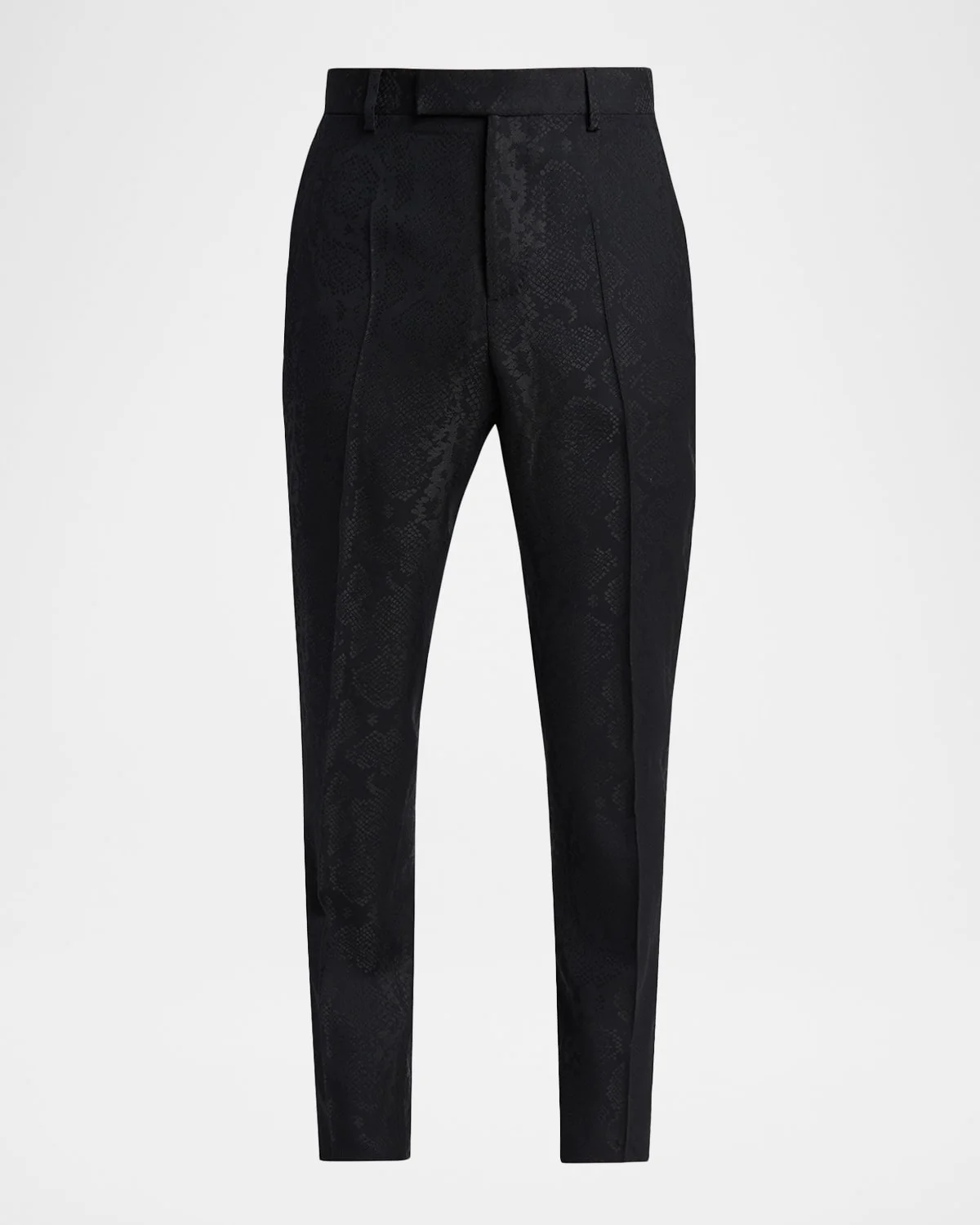 Cut from tonal python jacquard, these Versace formal pants fuse an exotic pattern with precision tailoring through a crisp front pintuck Regular rise Side pockets; back welt pockets Straight legs taper slightly toward the ankle Tabhook/zip front; belt loops Virgin wool/viscose Lining: Cotton Made in Italy