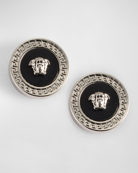 - Versace signature Medusa head stud earrings with resin detail. - Carved signature Greek key outline. - Brass with Tribute golden finish. - Post backs for pierced ears. - Made in Italy.