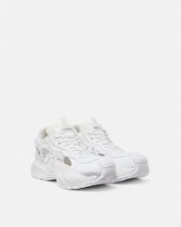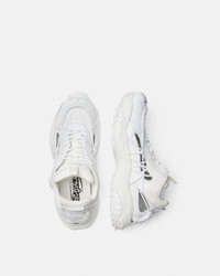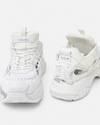 DETAILS A futuristic design fusing the codes of the House with intricate craftsmanship. Versace Mercury M_VS_01 is set on lightweight, shock-absorber Greca rubber and EVA soles. Cutout mesh uppers are distinguished by a hand-knotted rope construction. The footbed features dynamic, screen-printed Mercury lettering, and the tongue is detailed by a foil Versace logo and a jacquard Greca ribbon pull tab. - Versace logo on tongue - M_VS_01 style code on heel counter - Versace logo engraved rubber loop - Greca pull tab - Low top - Lace-up - Cutout - High rebound performance - Outer composition:100% Calf leather - Lining 1: 100% Nylon - Lining 2: 100% Calf leather - Trim 1: 100% Calf leather - Trim 2: 100% Polyester - Sole: 100% Rubber - Outsole made with 20% pre-consumer recycled rubber Item: 1016711-1A11861_1W000 SIZE & FIT - The shoe weighs approximately 21.2 oz / 0.6 kg for the model size 45 IT - Footbed: comfortable - Fits true to size, take your normal size
