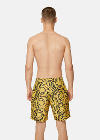 These mid-length swim shorts feature the signature Barocco print and an elasticated drawstring waistband. DETAILS & CARE - Gold Barocco print - Adjustable drawstring - Outer Fabric: 100% Polyester - Lining: 93% Polyester, 7% Elastane - Do not iron - Delicate dry clean - Hand wash gently using mild detergent - Do not bleach - Do not tumble dry SIZE & FIT - All sizes fit Italian standards - The Model is 1,89 m and wears a size 3