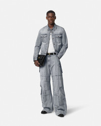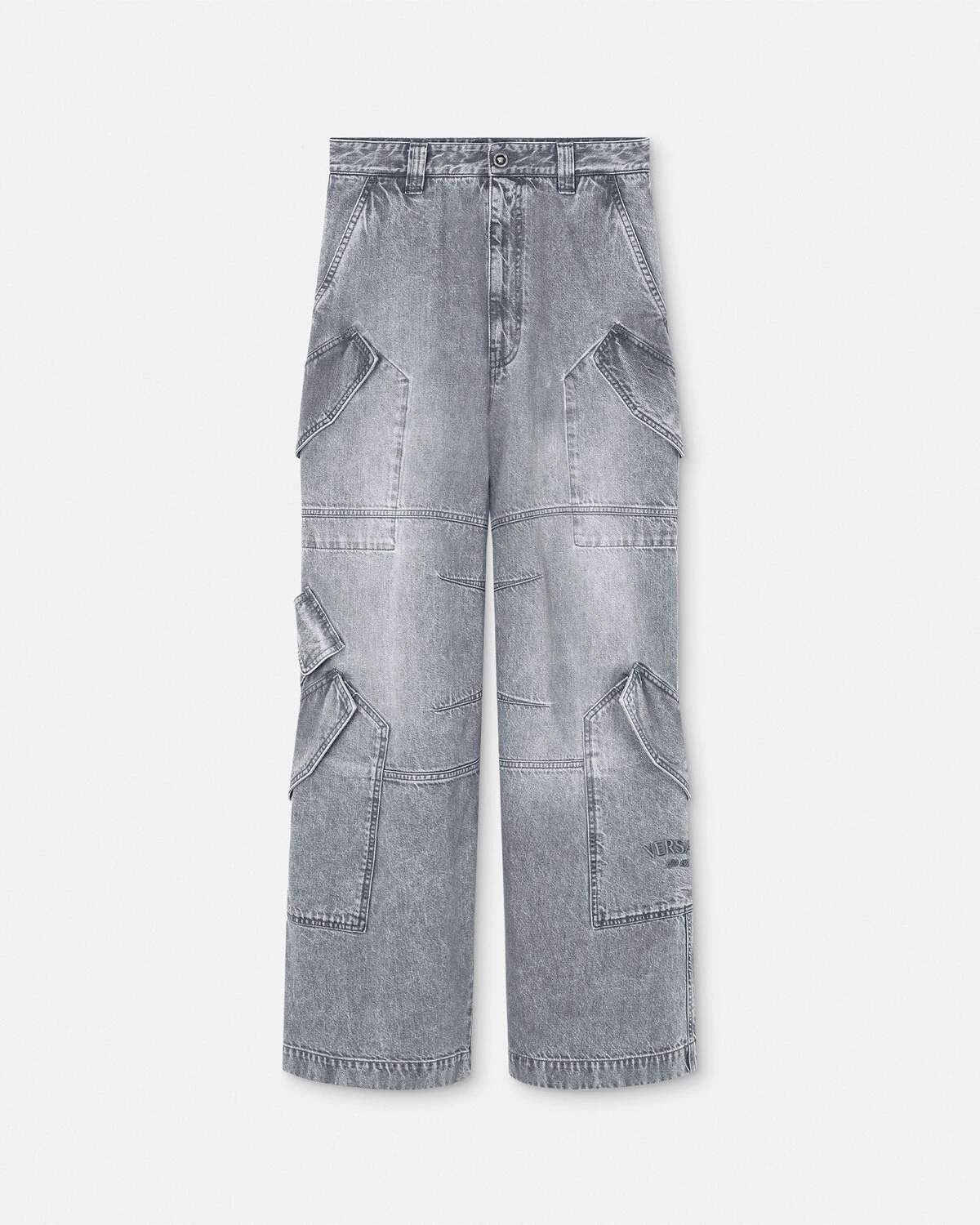 DETAILS Wideleg stonewashed jeans featuring cargo pockets and an enamel Medusa button - Medusa hardware - Versace logo leather patch - Belt loops - Front button and zip closure - Side pockets - Back welt pockets - Front cargo pockets - Outer composition: 100% Cotton - Lining: 65% Polyester, 35% Cotton - Embroidery: 100% Polyester - Trim: 100% Calf leather Item: 1015845-1A11349_1D280 SIZE & FIT - The model is 6'2" tall and wears size 32 IT