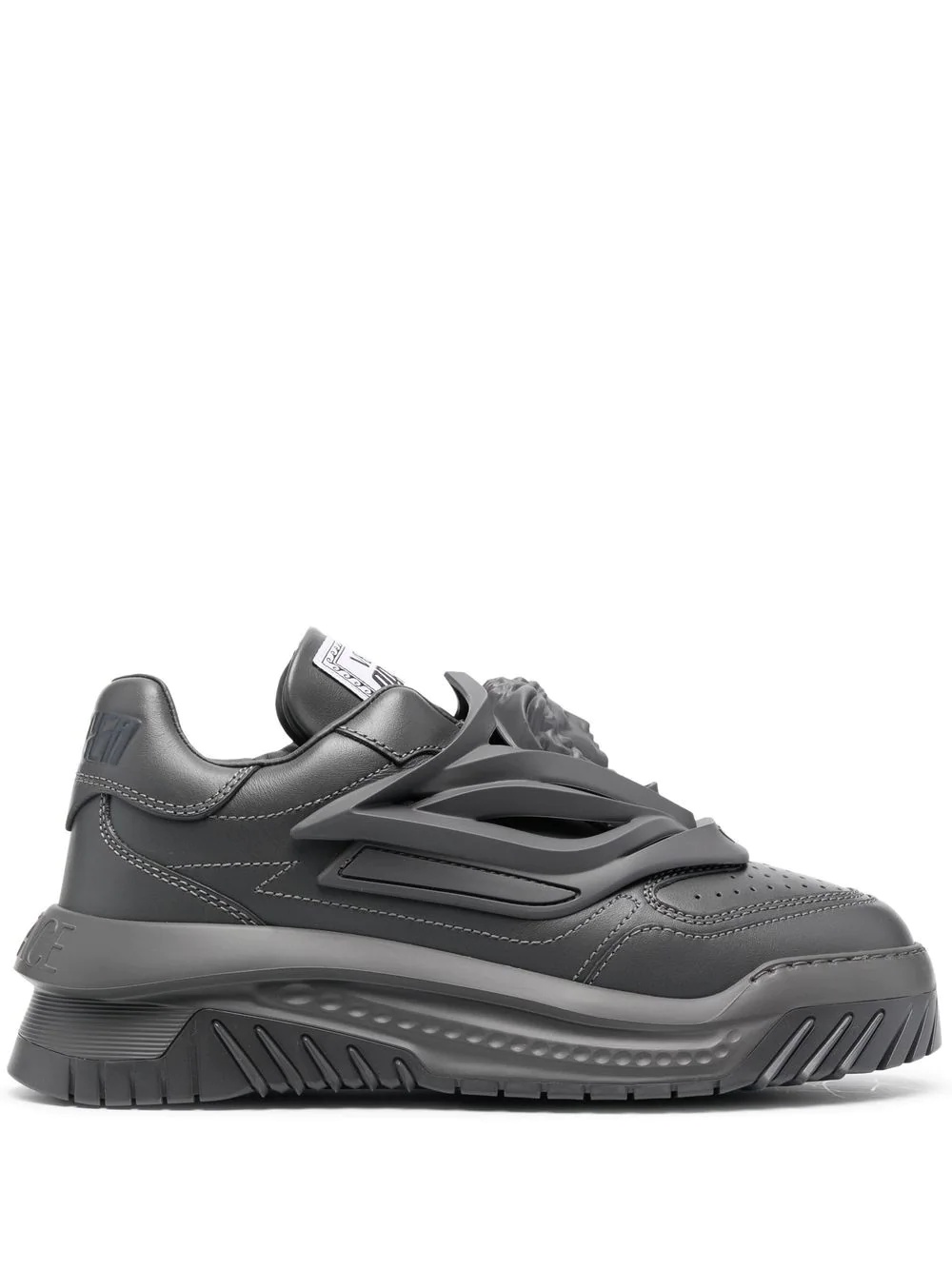 Odissea chunky leather sneakers Odissea chunky leather sneakers from Versace featuring grey, calf leather, Medusa Head motif, logo patch at the tongue, elasticated panelling, round toe and ridged rubber sole. Made in Italy Composition Outer: Calf Leather 100% Lining: Calf Leather 100% Sole: Rubber 100% SIZE & FIT Measurement HEEL 2 in(5 cm)