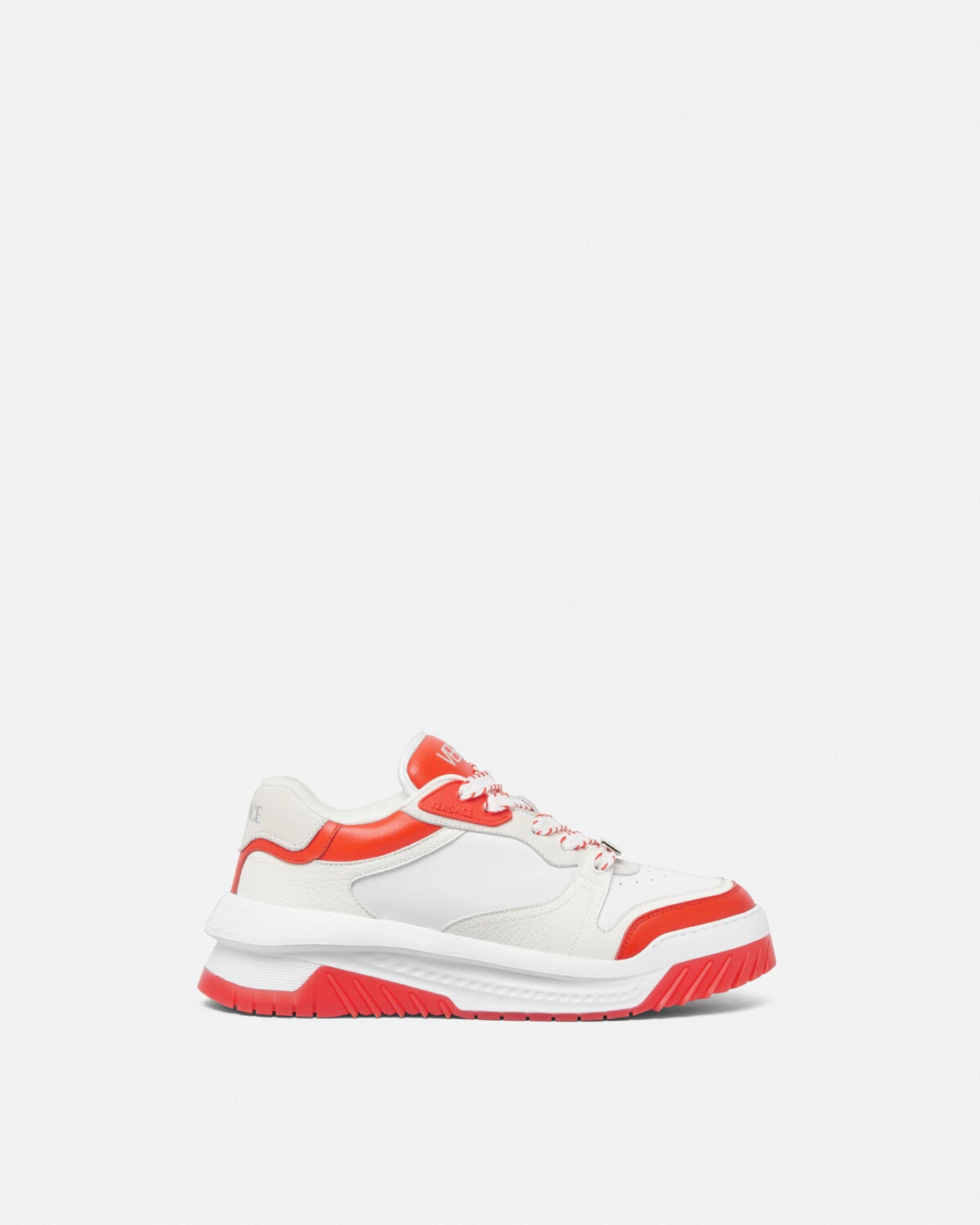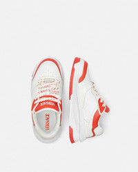 DETAILS A modern dynamic style, these lightweight lace up sneakers are set on rubber soles featuring a Greca detail on front and a Versace logo embroidery on the tongue. - Greca motif - Versace logo on tongue and heel counter - Low top - Lace up - Perforated toe caps - Rubber soles - Outer composition: 100% Calf leather - Lining 1: 100% Nylon - Lining 2: 100% Calf leather - Trim 1: 100% Calf leather - Trim 2: 100% Polyester - Sole: 100% Rubber Item: 1015437-1A10925_2R44P SIZE & FIT - The shoe weighs approximately 20 oz for the model size 44 IT - Comfortable footbed - Fits true to size, take your normal size