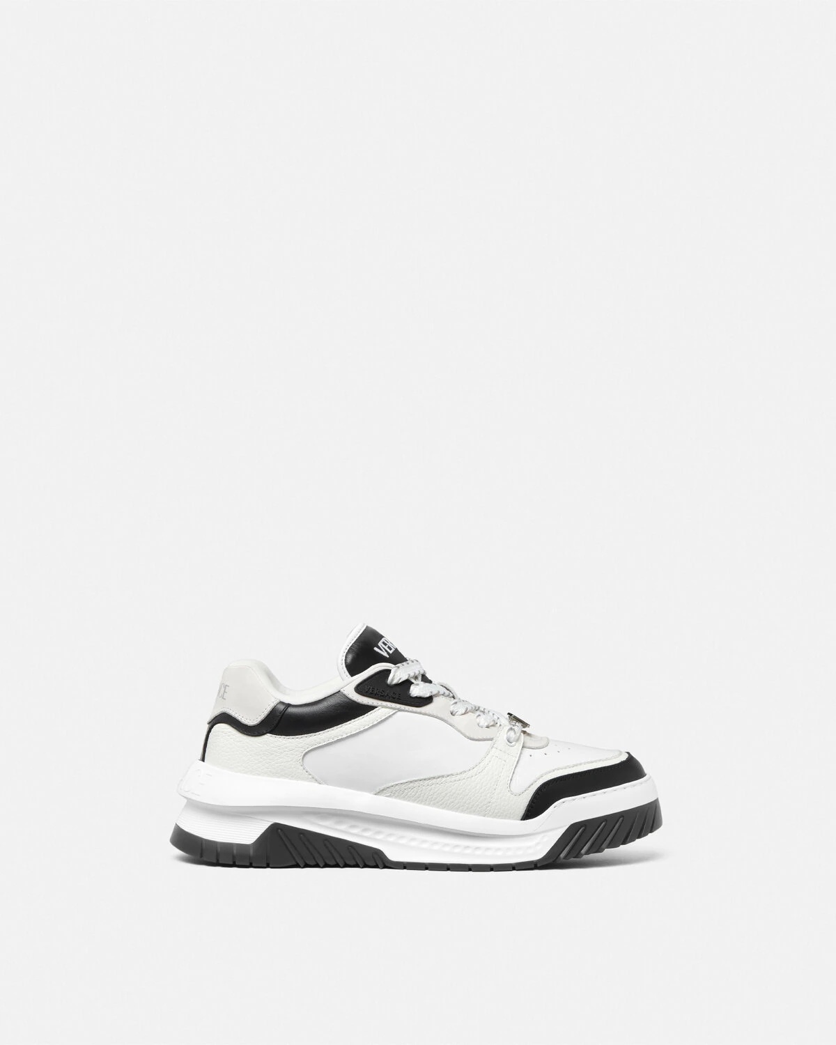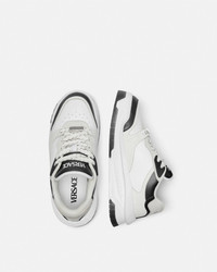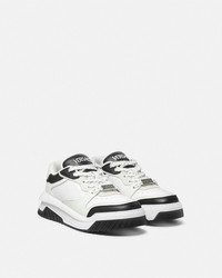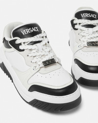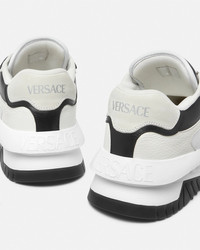 DETAILS A modern dynamic style these lightweight lace up sneakers are set on rubber soles featuring a Greca detail on front and a Versace logo embroidery on the tongue - Greca motif - Versace logo on tongue and heel counter - Low top - Lace up - Perforated toe caps - Rubber soles - Outer composition: 100% Calf leather - Lining 1: 100% Nylon - Lining 2: 100% Calf leather - Trim 1: 100% Calf leather - Trim 2: 100% Polyester - Sole: 100% Rubber Item: 1015437-1A10925_2B02P SIZE & FIT - The shoe weighs approximately 21.2 oz / 0.6 kg for the model size 44 IT - Footbed: comfortable - Fit is true to size, we recommend taking your normal size