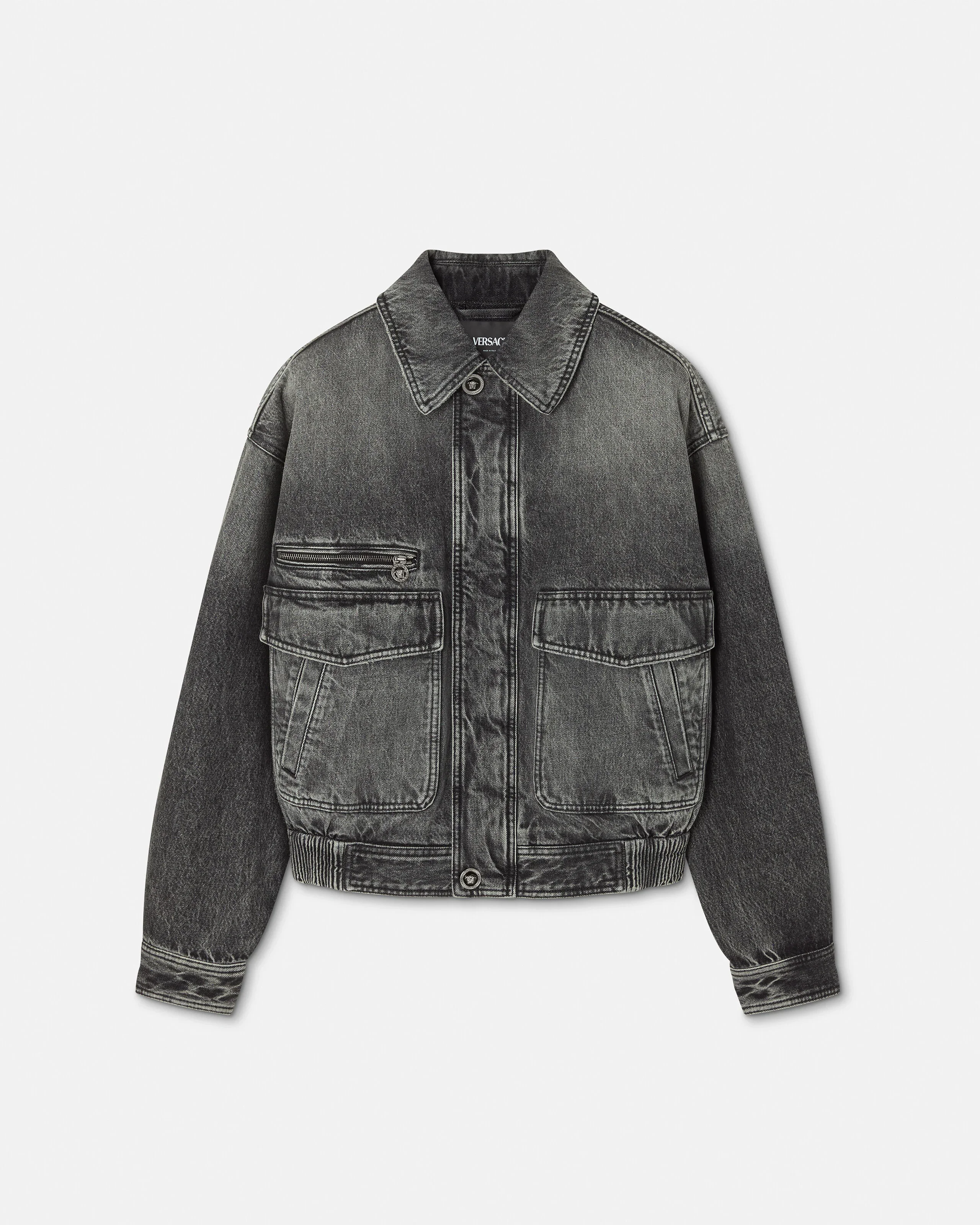 This denim blouson jacket in a dark stonewashed finish is slightly padded and features enamel Medusa snap buttons. - Medusa hardware - Versace Logo leather patch - Long sleeves - Pointed collar - Two-way front zip closure - Front snap-buttoned closure - Chest zipped pocket - Front flap pockets - Elastic waistband - Buttoned cuffs - Outer composition: 100% Cotton - Lining: 100% Polyester - Trim: 100% Calf leather - Padding: 100% Polyester Item: 1021754-1A16053_1D980