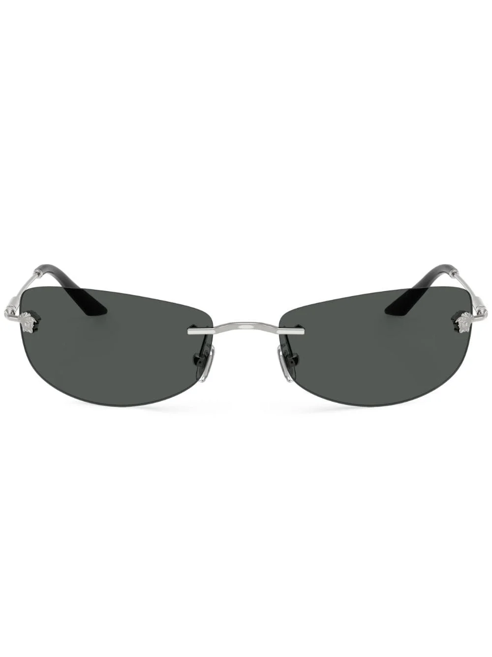 rectangle-frame sunglasses Highlights - Silver-tone - Rectangle frame - Tinted lenses - Signature medusa head rivet detailing - Straight arms - Logo plaque at the arm - Curved tips - These glasses come with a protective case. Made in United States Composition Metal 100% SIZE & FIT Measurement Arm Length 5.31 in(13.5 cm) Bridge Width 0.7 in(1.8 cm) Lens Diameter 2.36 in(6 cm) Total Width 5.43 in(13.8 cm)