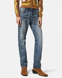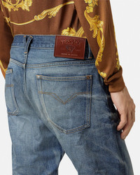 DETAILS These regularfit mediumwash jeans are crafted from traditional Japanese denim renowned for its unique handtreated fade and durable quality overtime The fivepocket design is accented by Medusa Biggie hardware and features a selvedge edge - Medusa Biggie hardware - Made in Japan Versace Logo leather patch - Belt loops - Five-pocket design - Front button and zipper closure - Outer composition: 100% Cotton - Trim: 100% Calf leather Item: 1019462-1A14405_1D800 SIZE & FIT - The model is 6'2" / 1.87 m tall and wears size 29 IT
