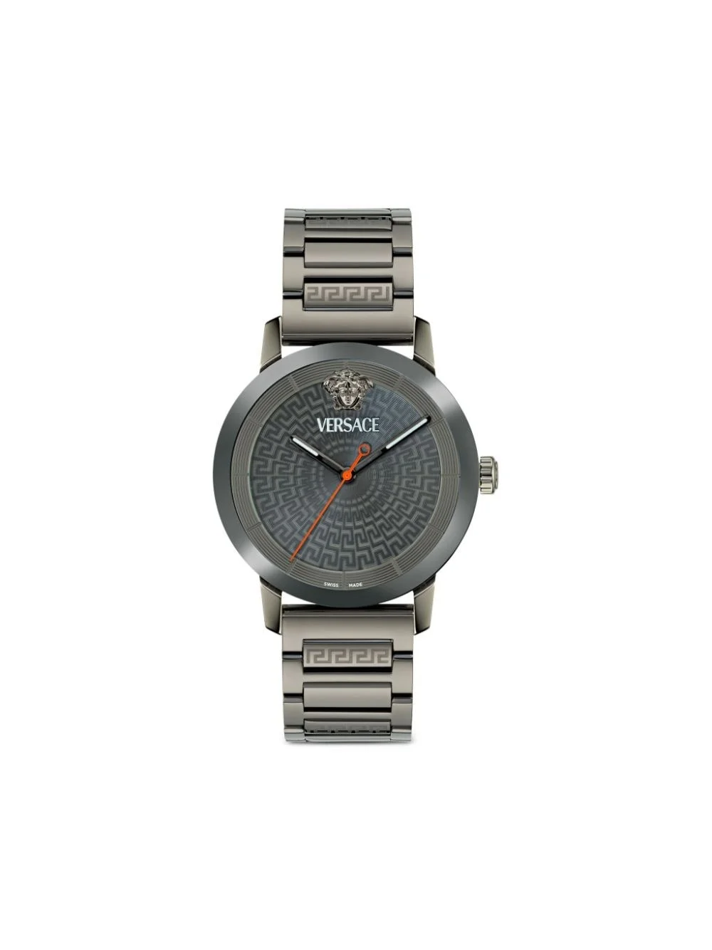 V-Helix 40mm Highlights - 40mm - Gunmetal grey - Stainless steel - Signature greca detailing - Round face - Baton hands - Screw-down crown - Stainless steel link bracelet - Folding clasp - Quartz movement Imported Composition stainless steel 100%, Sapphire Crystal 100% SIZE & FIT Measurement DIAMETER 1.57 in(4 cm)