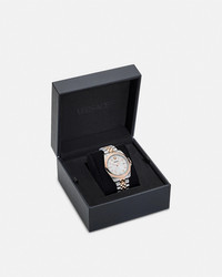 DETAILS Item: - Case: Staineless Steel case - Dial: White-Silver patterned dial with Medusa and Versace logo at 12h - Bracelet: Bicolor (SS&IP2N) band with butterfly buckle - Movement: RONDA 512.2 Swiss Quartz 3-hands movement - Water Resistant: 5 ATM Item: PVE9H004-P0024_RTU_TU_PNUL__ SIZE & FIT - Case: 1.6" / 41 mm