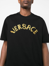 Seashell Baroque cotton T-Shirt Versace imaprts a fresh twist on its logo in the design of this cotton T-shirt. The emblem is made up of Baroque seashells that sit in gold contrast to the black backdrop. Highlights - Black - Cotton - Crew neck - Short sleeves - Logo print at the chest - Straight hem Made in Italy Composition Cotton 100% SIZE & FIT Model measurements Height 6 ft 2 in(1.88 m) Bust/Chest 35.03 in(89 cm) Hips 35.82 in(91 cm) Waist 27.95 in(71 cm) FittingInformation Designed for a relaxed fit, this piece allows for comfort and movement when worn Made from a midweight non-stretch fabric, this piece offers minimal elasticity when worn This piece fits true to size – take your usual size