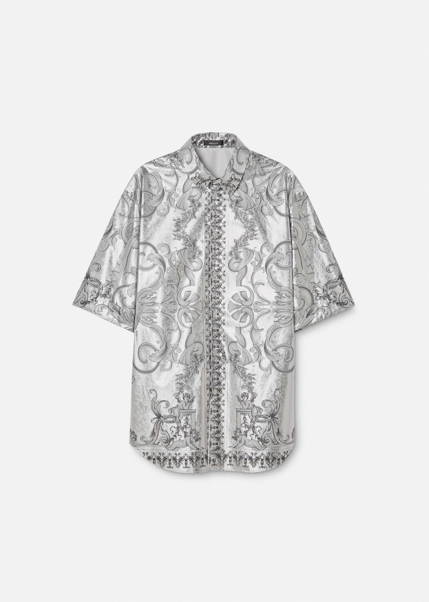 Made from pure silk, this short-sleeved shirt features a tonal Silver Baroque print with a loose fit. The button-down style is finished with a pointed collar and wide sleeves. DETAILS & CARE - Silver Baroque motif - Logo - Short sleeves - Pointed collar - Front button closure - Outer fabric: 100% Silk - Cool iron - Delicate dry clean - Do not bleach - Do not tumble dry - Do not wash SIZE & FIT - College Fit - All sizes fit Italian standards