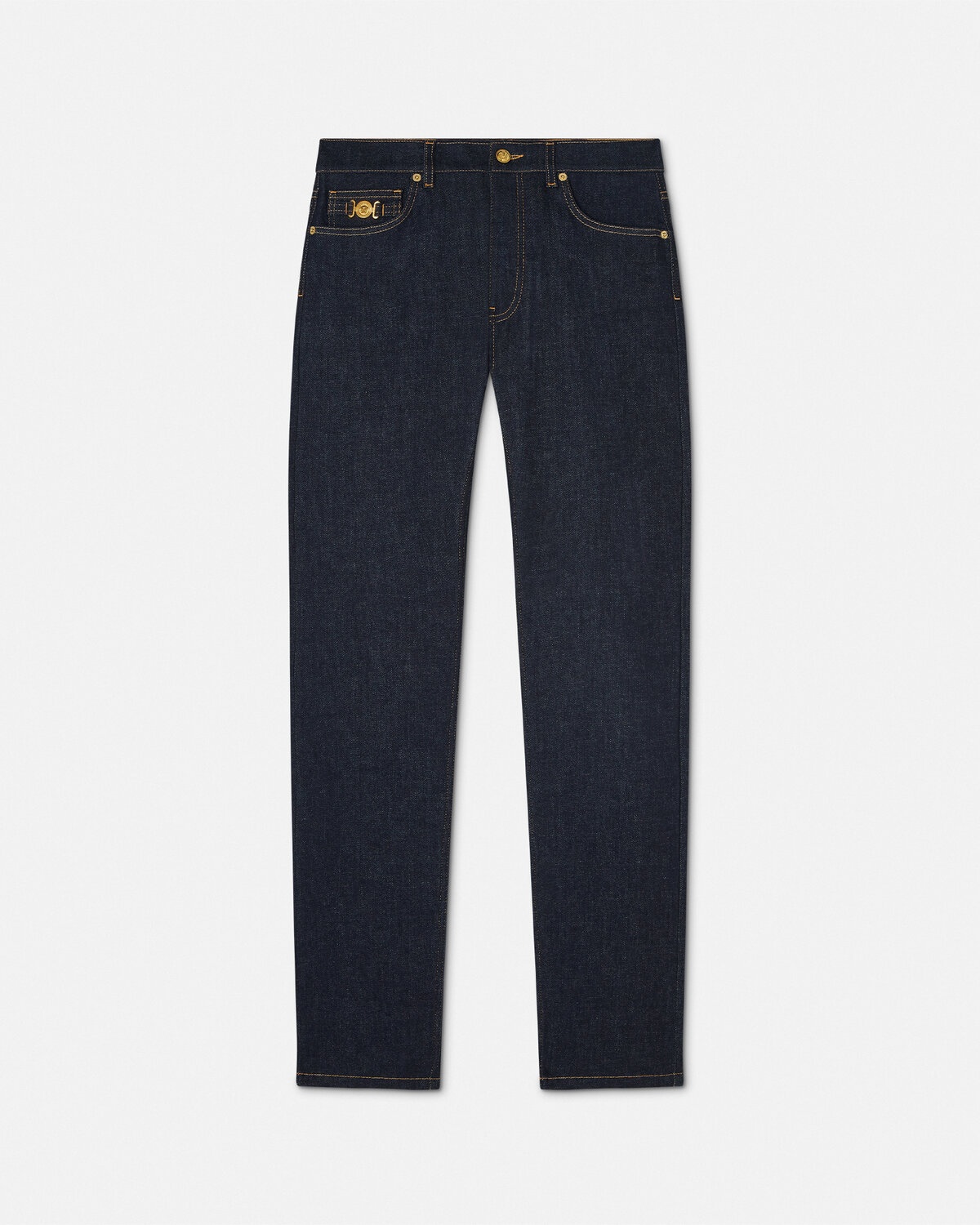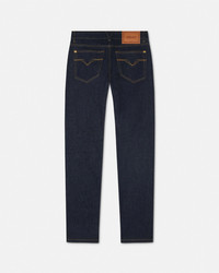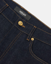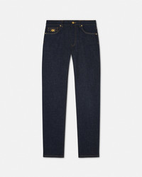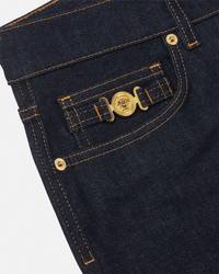 DETAILS These slimfit darkblue cotton denim jeans are detailed with the Medusa Biggie hardware at the fifth pocket and with an enamel Medusa button at the front closure - Medusa Biggie hardware - Medusa hardware - Back leather logo patch - Belt loops - Front button and zipper closure - Five-pocket design - Outer composition: 88% Cotton, 11% Polyester, 1% Elastane - Trim: Calf leather Item: 1011693-1A11927_1D100