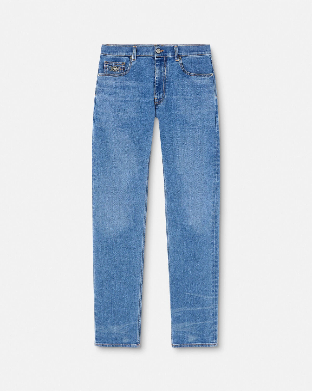 DETAILS These medium-washed Slim Fit jeans are made from cotton denim featuring a Medusa Biggie hardware at the front pocket. - Medusa Biggie hardware - Medusa hardware - Belt loops - Front button and zip closure - Five-pocket design - Back leather logo patch - Outer composition: 88% Cotton, 11% Polyester, 1% Elastane - Lining: 65% Polyester, 35% Cotton - Trim: 100% Calf leather Item: 1011693-1A09961_1D360 SIZE & FIT - The model is 6'2" tall and wears size 32 IT