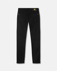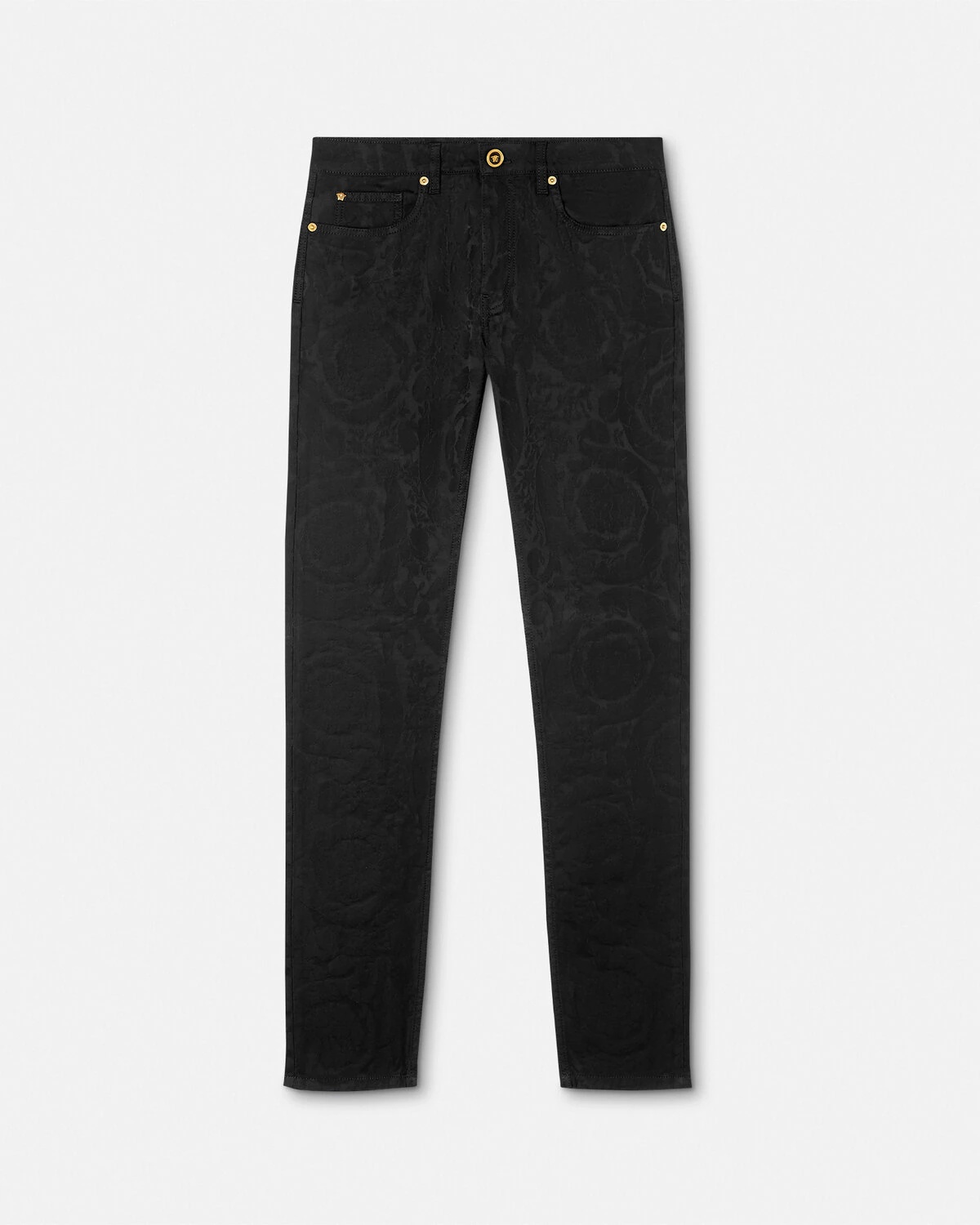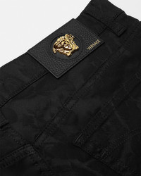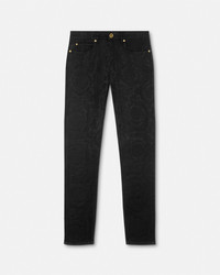 DETAILS These dark stonewashed slimfit jeans have a fivepocket design and feature an allover Barocco jacquard tonal motif - Barocco motif - Medusa hardware - Belt loops - Front button and zipper closure - Five-pocket design - Outer composition: 98% Cotton, 2% Elastane - Lining: 65% Polyester, 35% Cotton - Trim: 100% Calf leather Item: A81832-1A13577_1B000