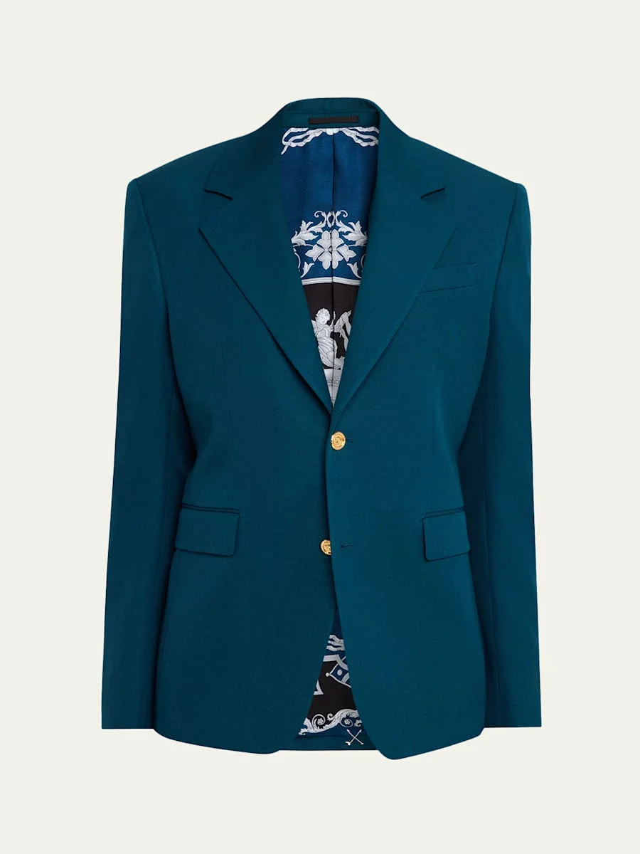 This slimfit singlebreasted blazer is crafted from compact wool and features a Hall of Heroes printed lining, a reinterpretation of an archival Versace Home print featuring classical statues, deities and Barocco motifs. Notch lapels Long sleeves Chest welt pocket Side flap pockets Buttonfront closure Virgin wool Dry clean Made in Italy