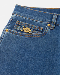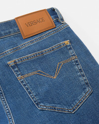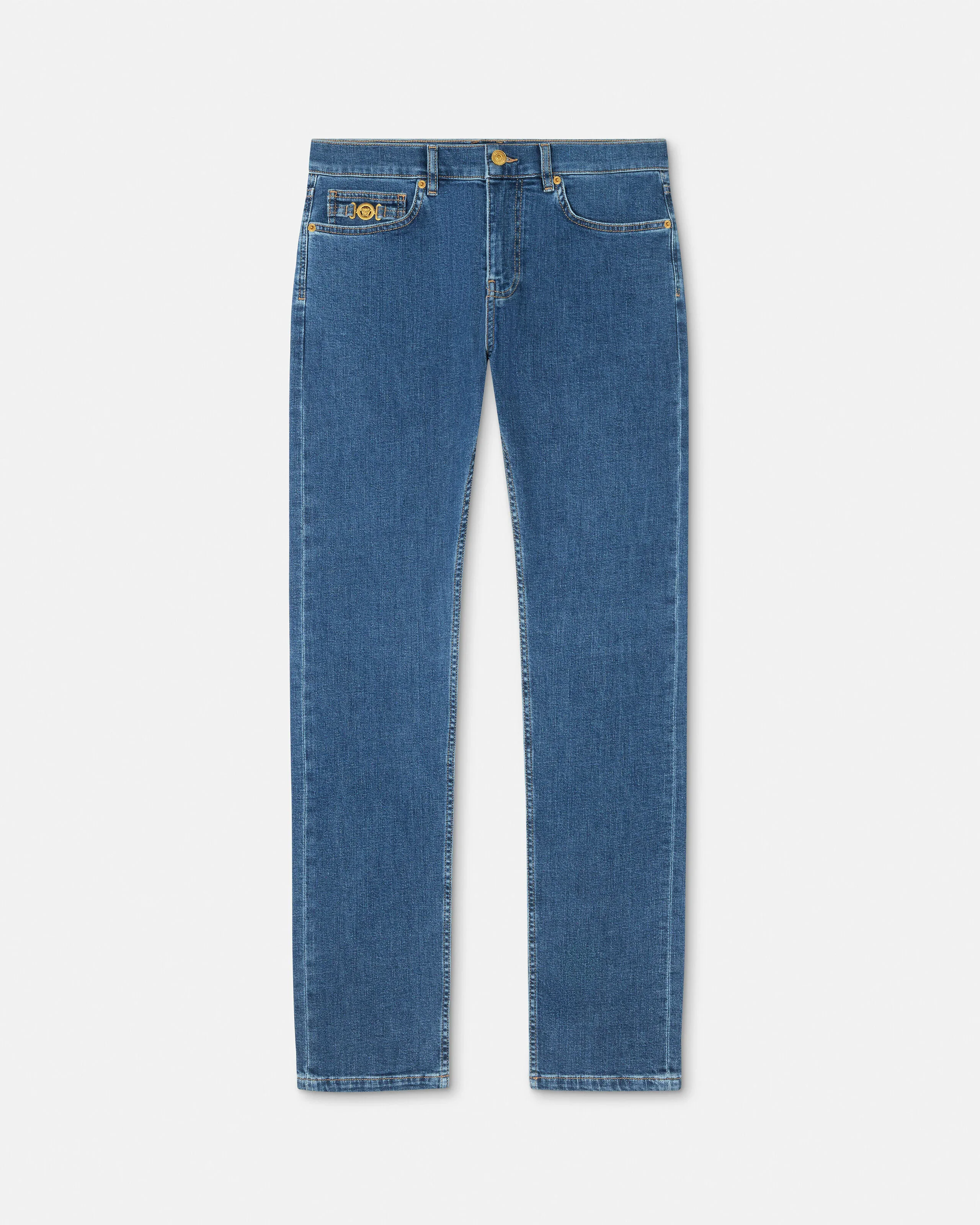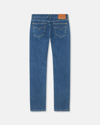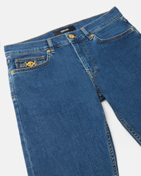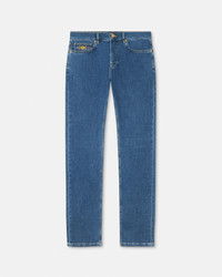 These slim-fit medium-wash jeans are made from cotton denim and feature Medusa Biggie hardware on the five-pocket design. - Medusa Biggie hardware - Versace Logo leather patch - Belt loops - Front button and zip closure - Five-pocket design - Outer composition: 99% Cotton, 1% Elastane - Trim: 100% Calf leather Item: 1019050-1A16479_1D800