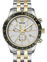 Sport Chrono 44mm Highlights - 44mm - Stainless steel - Round face - Geometric dial - Baton hands - Chronograph counters - Date indication - Medusa head motif - Quartz movement - Tachymeter scale - Two chronograph pushers - Screw-down crown - Adjustable link bracelet - Folding clasp - This item comes with a standard one-year warranty from the boutique. Imported Composition stainless steel 100% SIZE & FIT Measurement DIAMETER 1.73 in(4.4 cm)