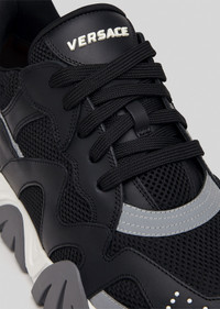 Inspired by the anatomy of the great white shark, the outsole of the Squalo sneakers evokes the shape of the animal's jaws. Leather details feature signature Versace top-stitching as a celebration of the brand’s heritage. The logo is featured on the tongue. Another house code – Medusa is hidden in the outsole, adding a subtle dose of decadence. DETAILS & CARE - Low top - Lace up - Logo accents - Top-stitched leather accents - Shark anatomy-inspired outsole - Hidden Medusa on the sole - Outer fabric: 100% Polyester - Insole: 90% Polyester 10% Elastane - Trim: 100% Leather - Sole: 100% Rubber - Do not machine wash - Made in Italy