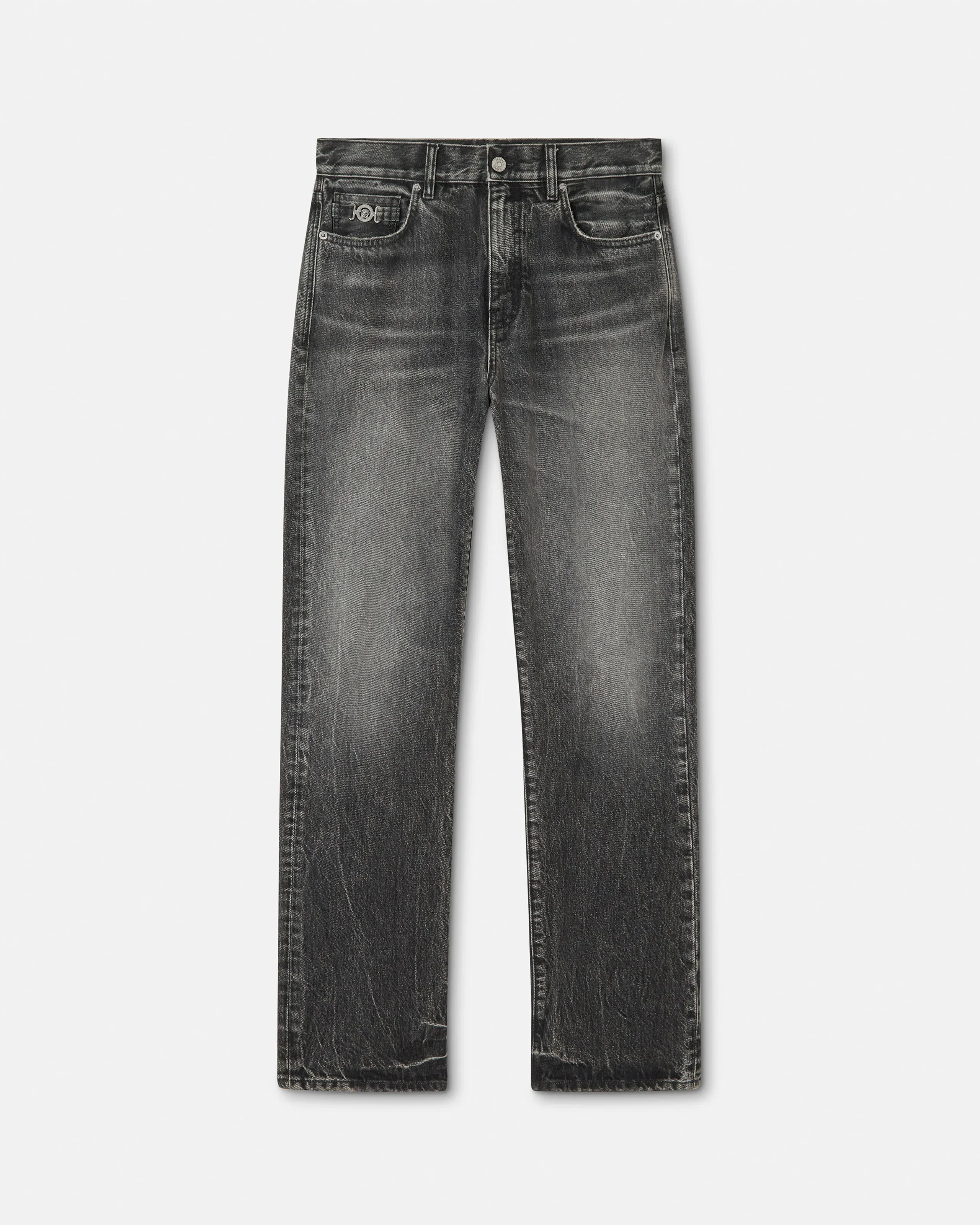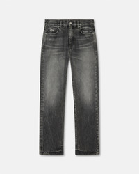 These loose-fit dark stonewashed jeans have a five-pocket design and are accented by a Medusa Biggie hardware piece and a Versace logo patch at the back. - Medusa Biggie hardware - Versace Logo leather patch - Belt loops - Front button and zip closure - Five-pocket design - Outer composition: 100% Cotton - Fabric made using organic cotton yarn - Trim: 100% Calf leather Size & Fit - The model is 6'1" / 1.86 m tall and wears size 32 IT Item: 1017775-1A16053_1D980