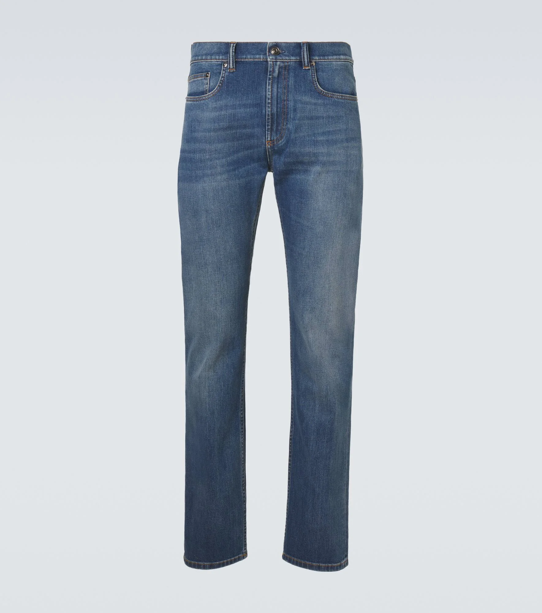 Update your denim rotation with modern styles from Versace, like these jeans. An endlessly versatile option, this pair features straight legs and a classic 5-pocket construction. Product Details - Material: 98% cotton, 2% elastane - Care instructions: machine wash at 30 degrees - Made in Italy - Color: blue - Designer color name: Medium Blue - Details: 100% calf leather - Closure: zipper fly, button fastening - Pockets: five pockets - Belt loops - Item number: P01149596 Size & Fit - True to size - Slightly stretchy fabric - Straight leg - Mid-rise - The model in the picture is 185cm-6'1" and wearing a size 32