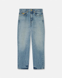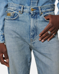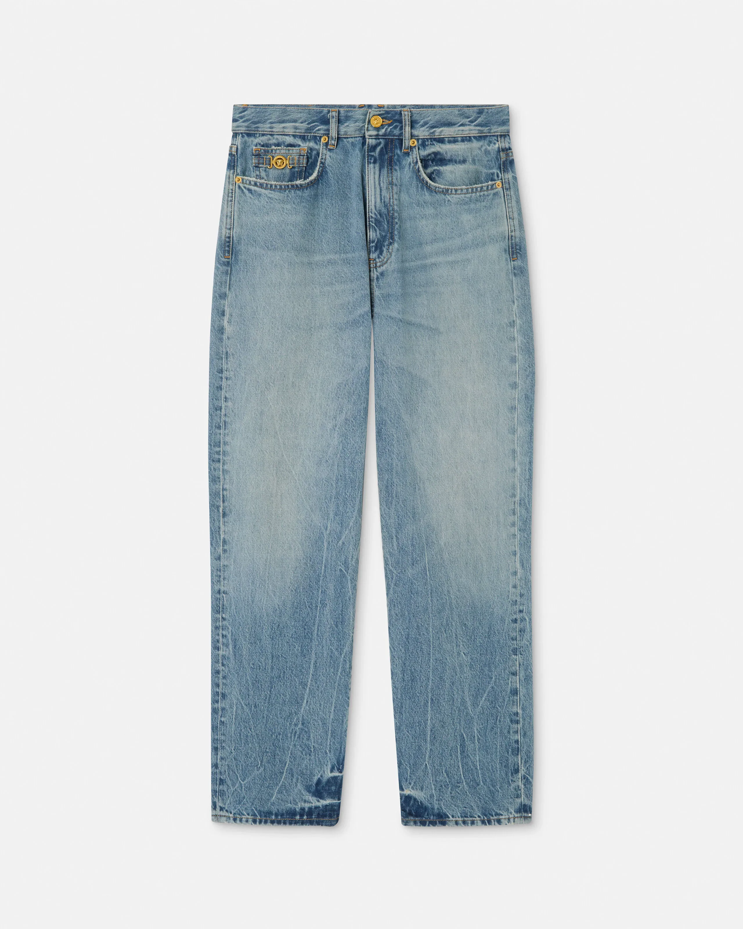 These pencil-fit light stonewashed jeans have a five-pocket design with distressed edges. They are accented by Medusa Biggie hardware and a Versace Logo patch at the back. - Medusa Biggie hardware - Versace Logo leather patch - Belt loops - Front button and zipper closure - Five-pocket design - Outer composition: 100% Cotton - Trim: 100% Calf leather Size & Fit - The model is 6'1" / 1.86 m tall and wears size 32 IT Item: 1020576-1A16386_1D190