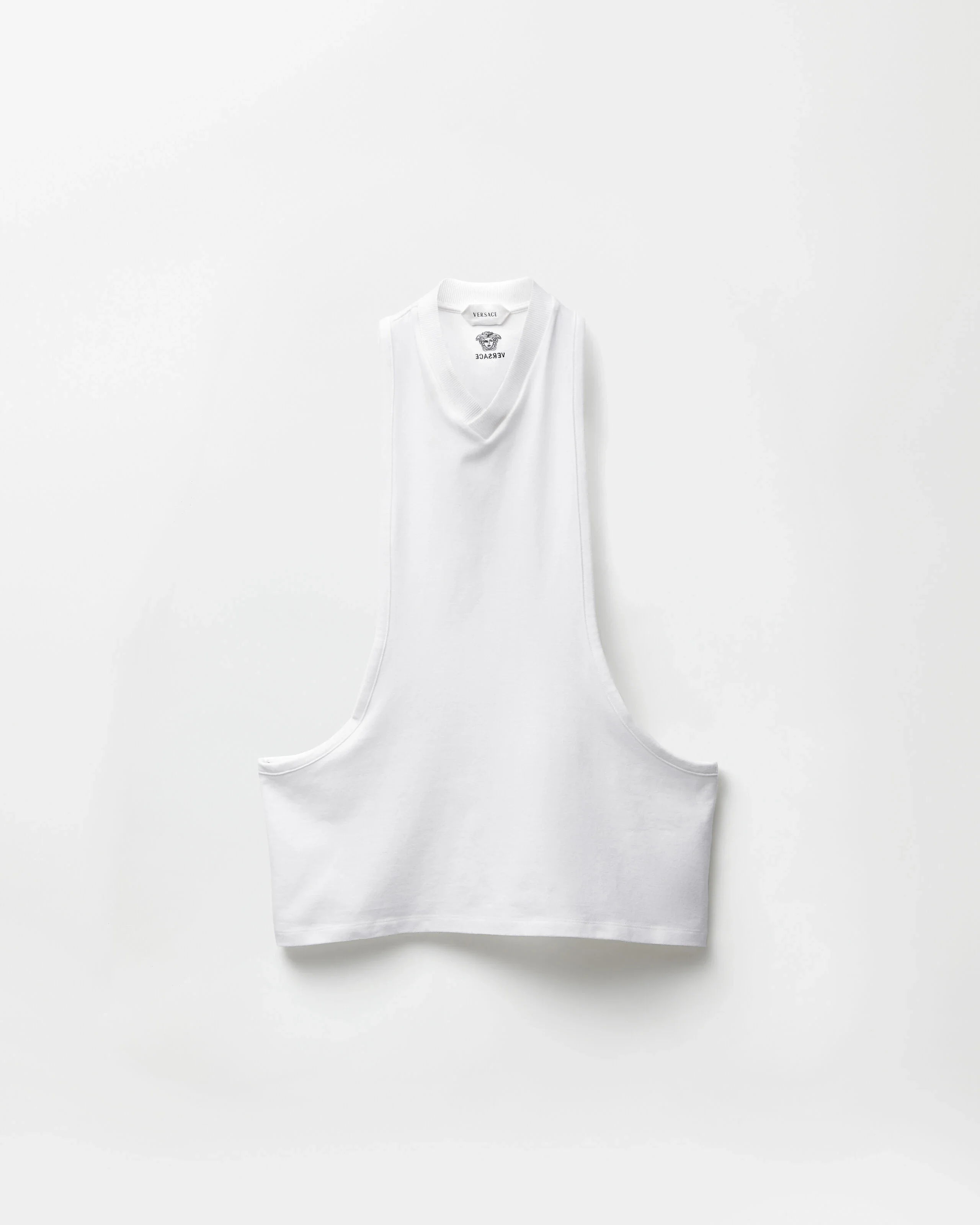 This stretch cotton-jersey tank top with deep cutout detailing features a ribbed V-neckline, and a Medusa and Versace Logo thread-embroidery at the back. - Versace Logo embroidery - Medusa embroidery - Sleeveless - V-neckline - Ribbed trims - Outer composition: 96% Cotton, 4% Elastane - Embroidery: 100% Polyester - Trim: 98% Cotton, 2% Elastane Size & Fit - The model is 6'0" / 1.84 m tall and wears size 48 IT Item: 1023750-1A17888_1W000