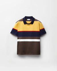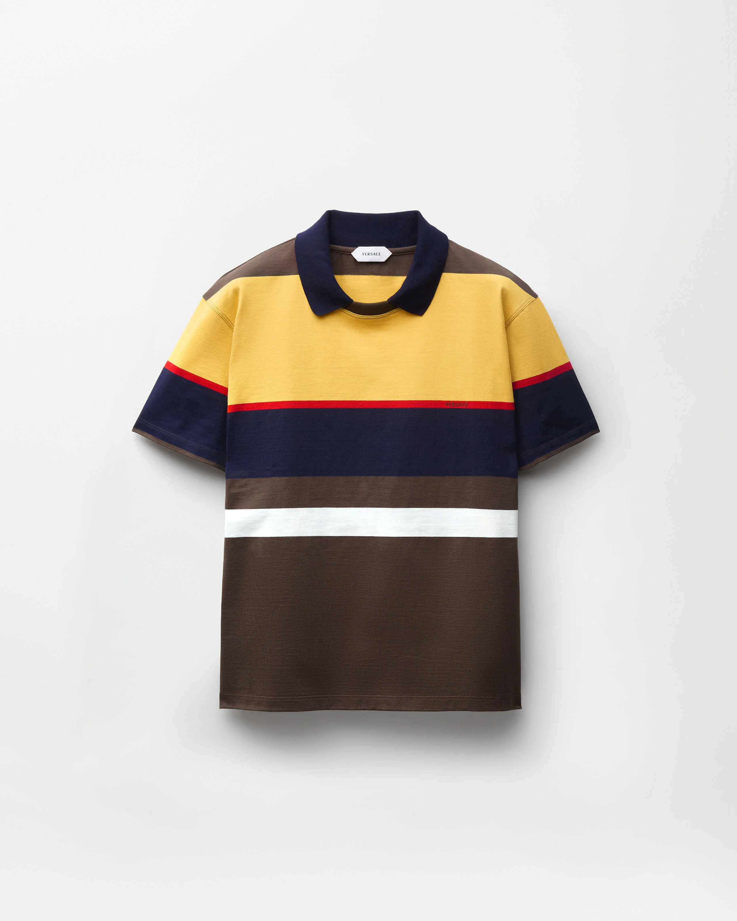 This compact cotton-jersey T-shirt features color-blocked stripes, a ribbed polo collar, and a small Versace Logo thread-embroidery at the chest. - Versace Logo embroidery - Short sleeves - Pointed collar - Crewneck - Ribbed trims - Outer composition: 100% Cotton - Embroidery: 100% Polyester - Trim: 91% Cotton, 7% Polyamide, 2% Polyurethane Item: 1024579-1A17890_6Y520