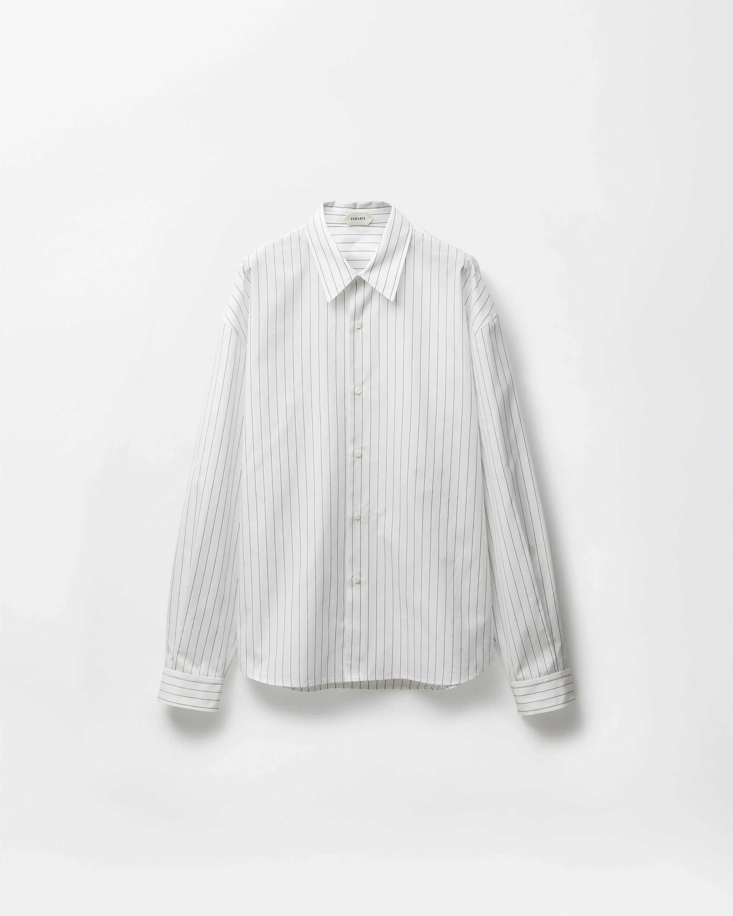 This long-sleeved shirt in cotton poplin has a loose fit and features a jacquard stripe pattern and a Versace Logo thread-embroidery at the back collar. - Versace Logo embroidery - Long sleeves - Pointed collar - Front button closure - Buttoned cuffs - Outer composition: 100% Cotton - Embroidery: 100% Polyester Size & Fit - The model is 6'1" / 1.85 m tall and wears size 48 IT Item: 1023795-1A17846_2WF40