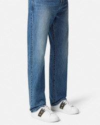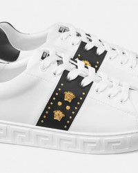 DETAILS These lowtop sneakers are characterized by an engraved Greca pattern on the soles featuring Medusa and round metal studs A foil Versace logo details the heel counter - Greca motif - Medusa hardware - Stud embellishments - Low-top - Lace-up - Round toe - Logo patch at the tongue - Logo on heel counter - Outer composition: 100% Nylon - Lining: 100% Polyester - Trim: 100% Nylon - Sole: 100% Thermoplastic polyurethane Item: 1014460-1A13065_2W02V SIZE & FIT - The shoe weighs approximately 21.2 oz / 0.6 kg for the model size 42 IT - Footbed: regular - Fits true to size, take your normal size