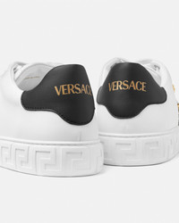These low-top sneakers are characterized by an engraved Greca pattern on the soles featuring Medusa and round metal studs. A foil Versace logo details the heel counter. - Greca motif - Medusa hardware - Stud embellishments - Low-top - Lace-up - Round toe - Logo patch at the tongue - Logo on heel counter - Outer composition: 100% Nylon - Lining: 100% Polyester - Trim: 100% Nylon - Sole: 100% Thermoplastic polyurethane Size & Fit - The shoe weighs approximately 21.2 oz / 0.6 kg for the model size 42 IT - Footbed: regular - Fits true to size, take your normal size Item: 1014460-1A13065_2W02V