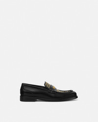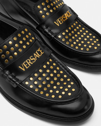 DETAILS These loafers are made from smooth calf leather and feature round metal studs and an accent metal Versace logo lettering on the uppers - Versace Logo hardware - Stud embellishments - Slip-on - Round toe - Penny loafer strap - Stacked heels - Outer composition: 100% Calf leather - Lining 1: 100% Calf leather - Lining 2: 88% Calf leather, 12% Goat leather - Sole: 100% Calf leather Item: 1017849-1A13379_1B00V SIZE & FIT - The shoe weighs approximately 17.7 oz / 0.5 kg for the model size 44 IT - Footbed: regular - Fits true to size, take your normal size